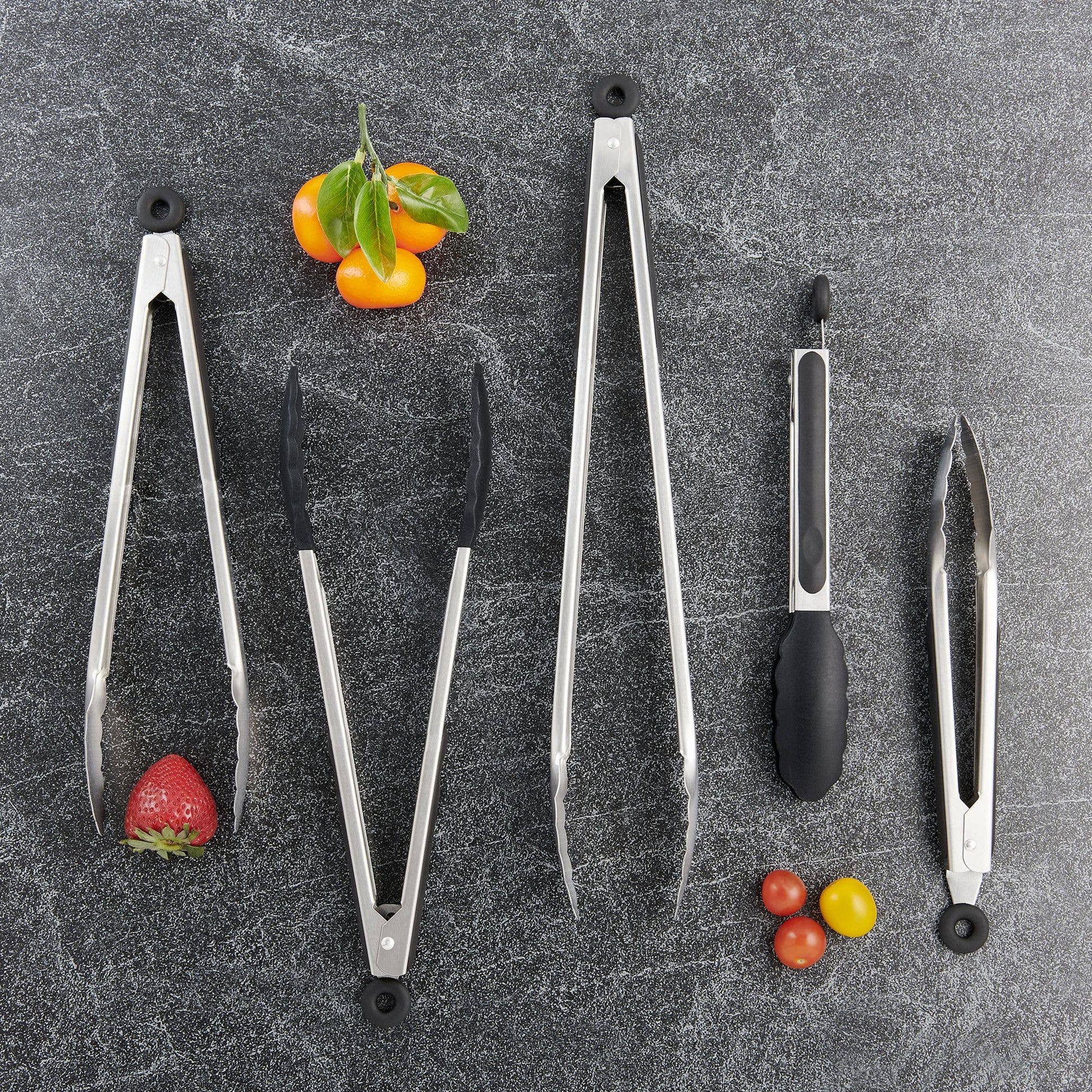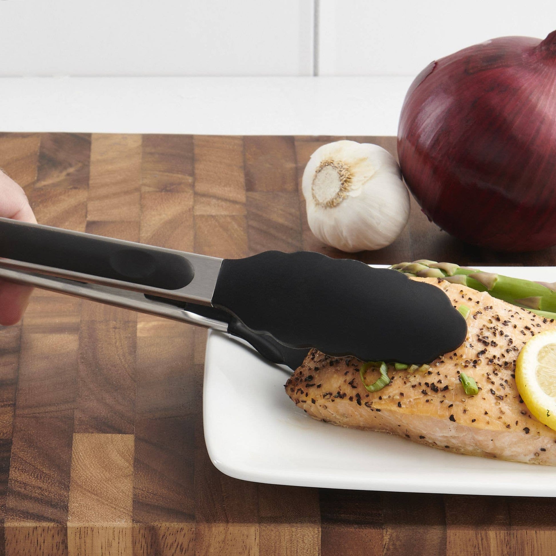Cutlery-Pro's Locking Tongs with Silicone Blades securely lift, turn, and drain food for mess-free serving.