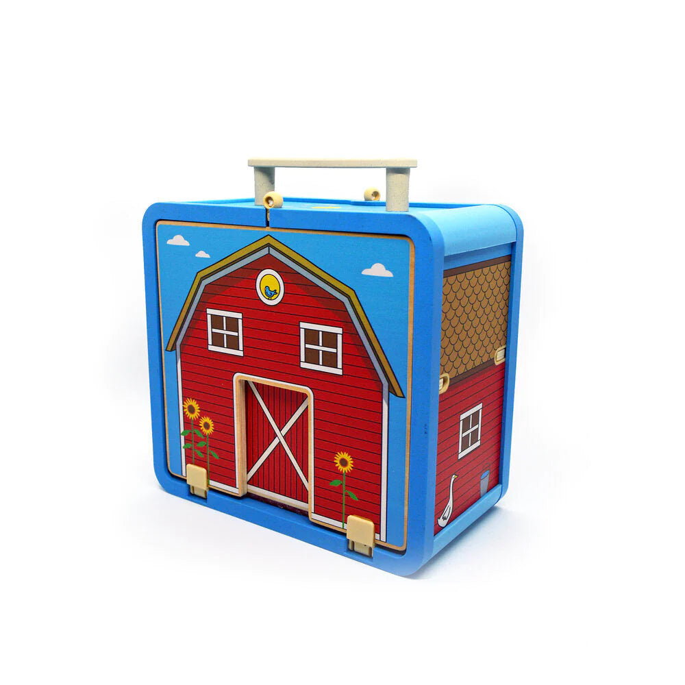 Introducing our new Suitcase Series that encourages portable play. Each wooden suitcase opens up to a world of fun. The 16-piece Barnyard has everything for fun on the go, including farmer kids, fences, farm animals, a tractor, and more!
