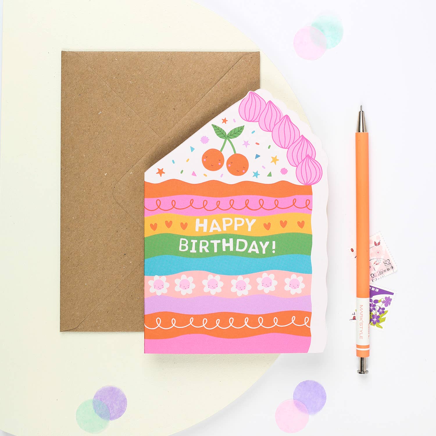 Who would like a slice of cake!!? This unique, shaped birthday card is shaped into a slice of rainbow birthday cake, complete with lots of sprinkles, hearts, flowers and a sweet cherry on top!