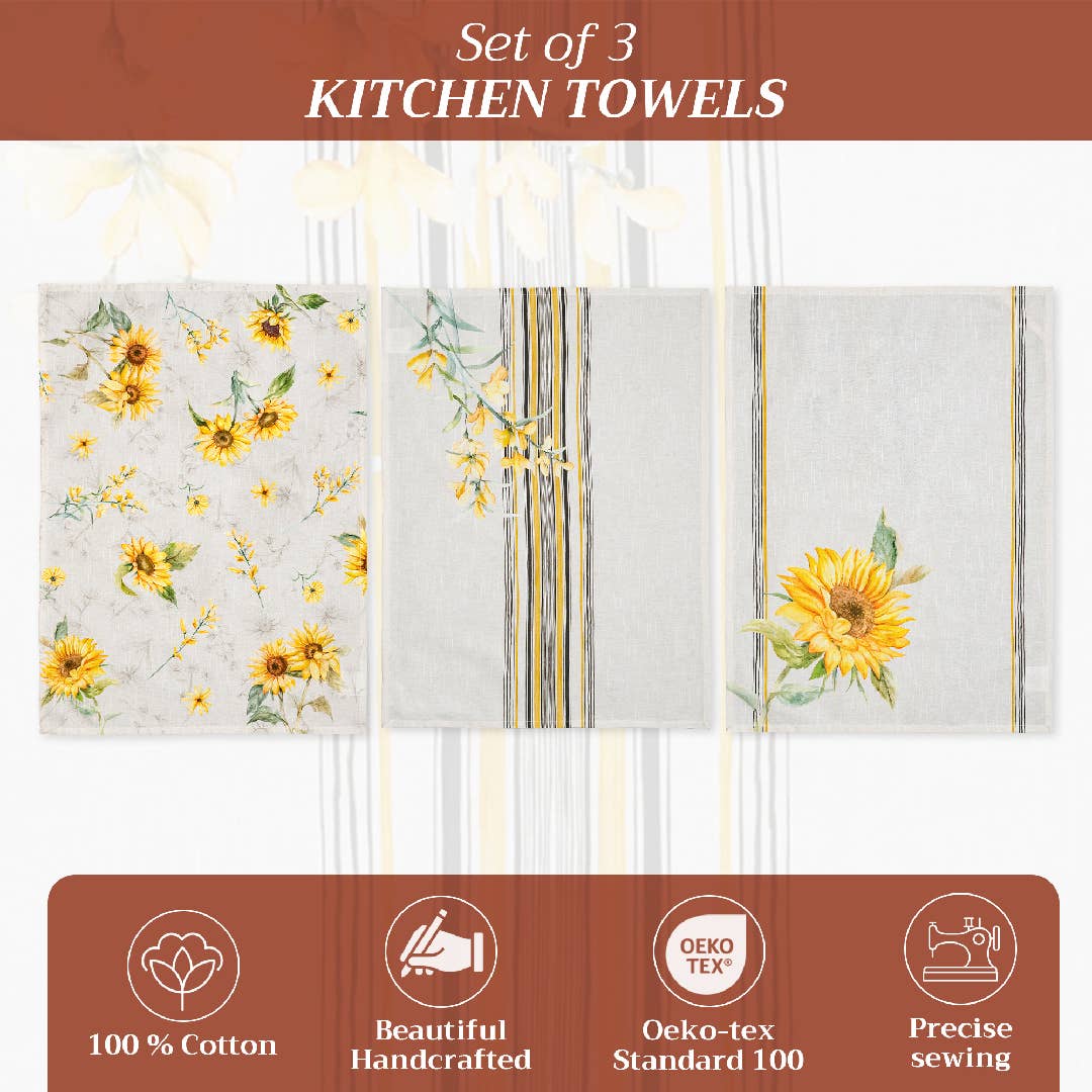 Made from 100% cotton, this set includes three kitchen towels, each with a unique design and measuring 20 by 27.5 inches — perfect for drying dishes, wiping counters, or simply adding a decorative accent to your space.