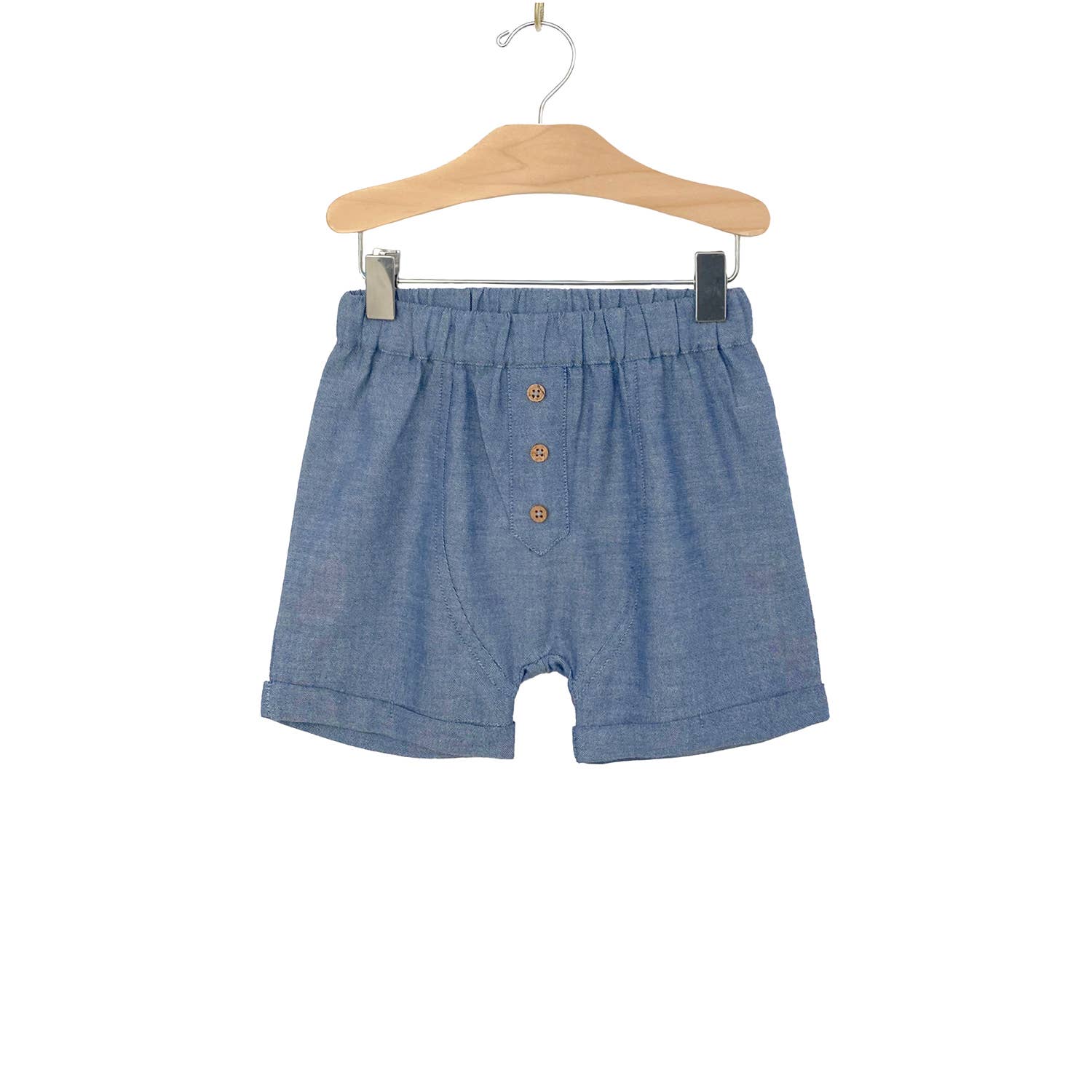 Made with 100% chambray cotton. Featuring a soft elastic waistband and coconut button detailing. The perfect short for everyday wear!