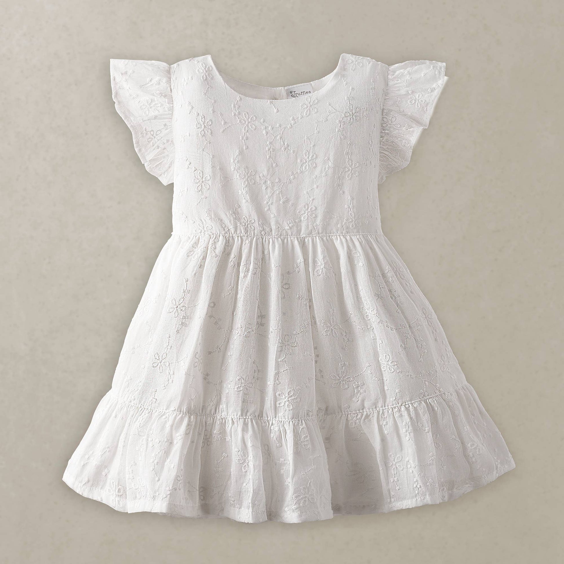 Gorgeous flutter sleeve 100% cotton dress adorned with floral embroidered stitching.