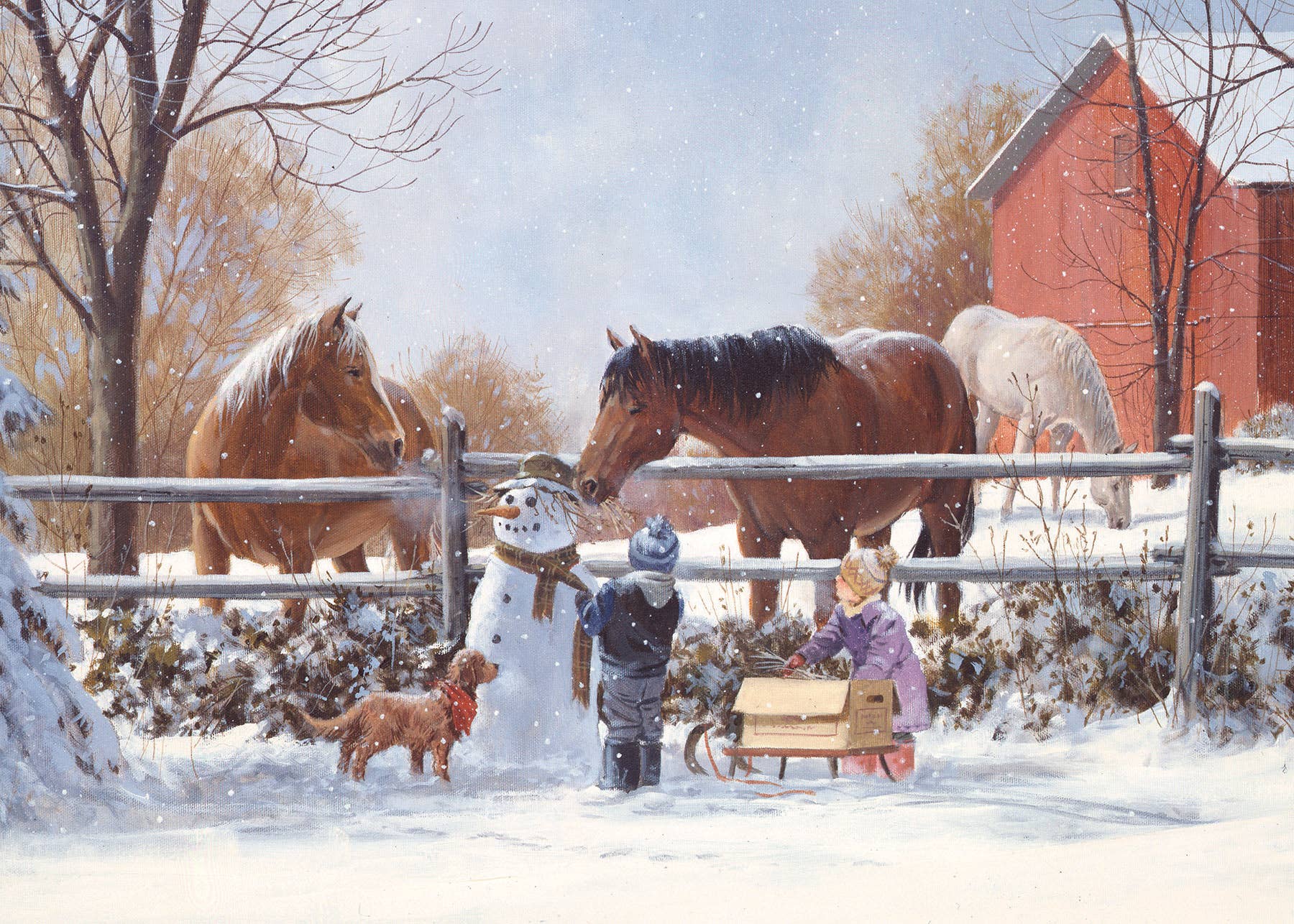 It looks like Fletcher, the dog, is going to pull Johnny's scarf right off! And Dexter, the horse, thinks his next meal is on the snowman's head! Hopefully there are more supplies in little Mable's box!