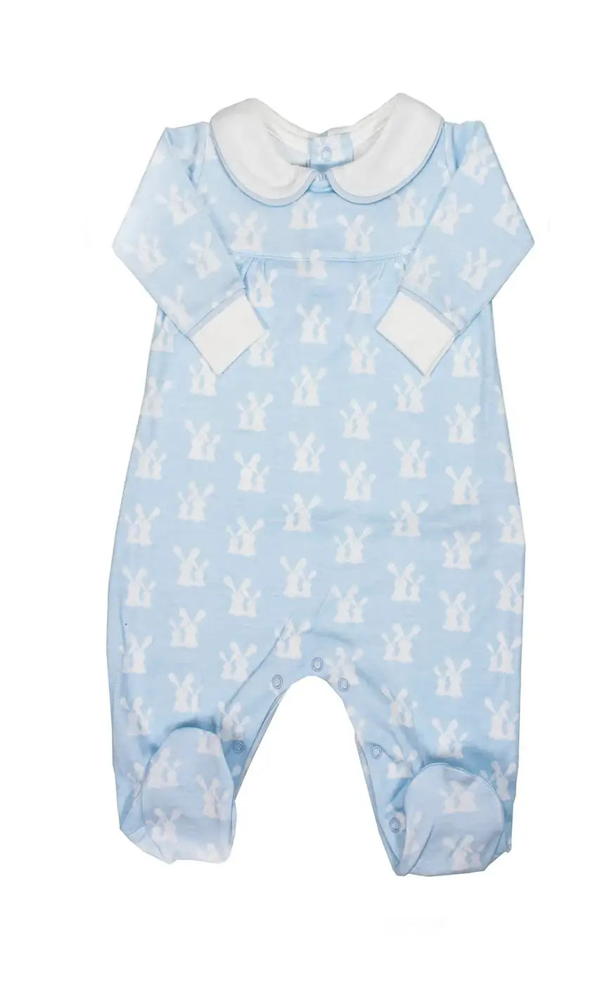 Adorable baby blue pajama with white bunnies. Comfortable and cute fashions for baby boys.