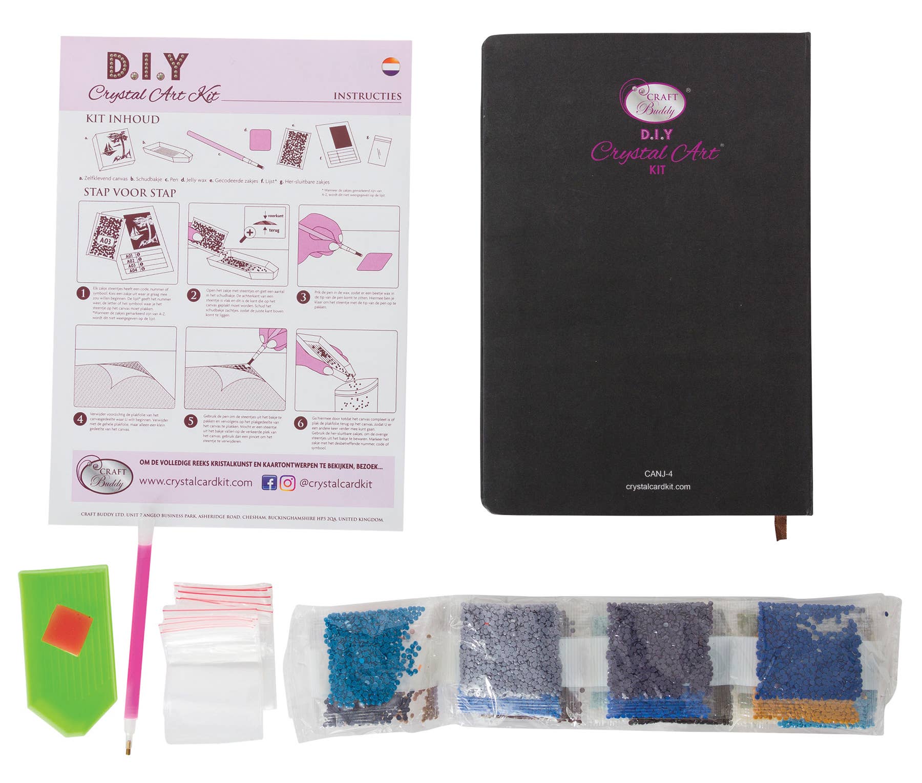Crystal Art Notebook Kit includes: Notebook Coded adhesive design template Coded pre-sorted crystal packets Double-sided crystal pick-up pen Jelly wax Grooved crystal tray Ziplock bags Instructions Ages: Ages 8+ Craft Type: Crystal Art Notebook Kit Jeweling
