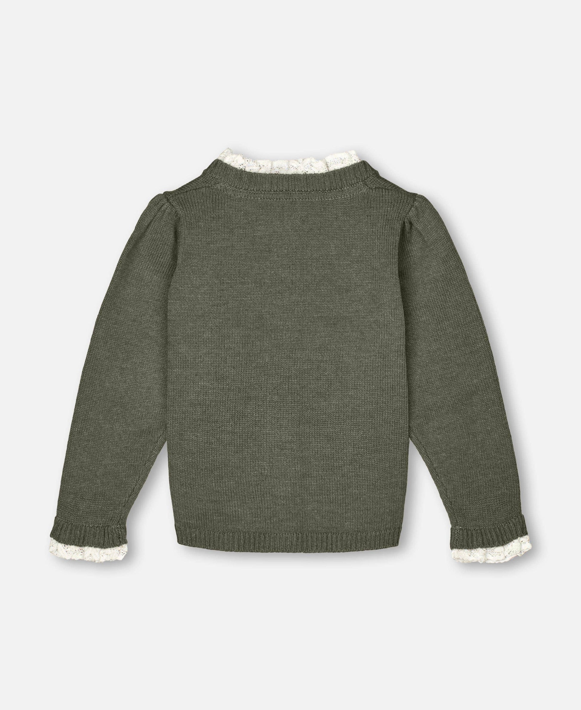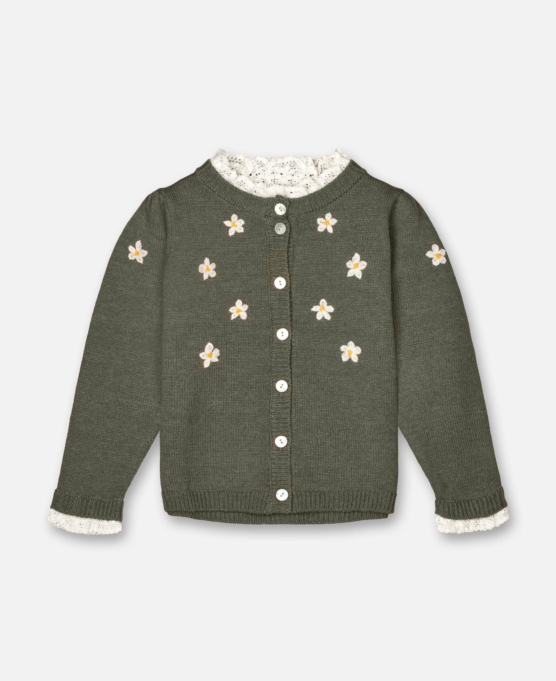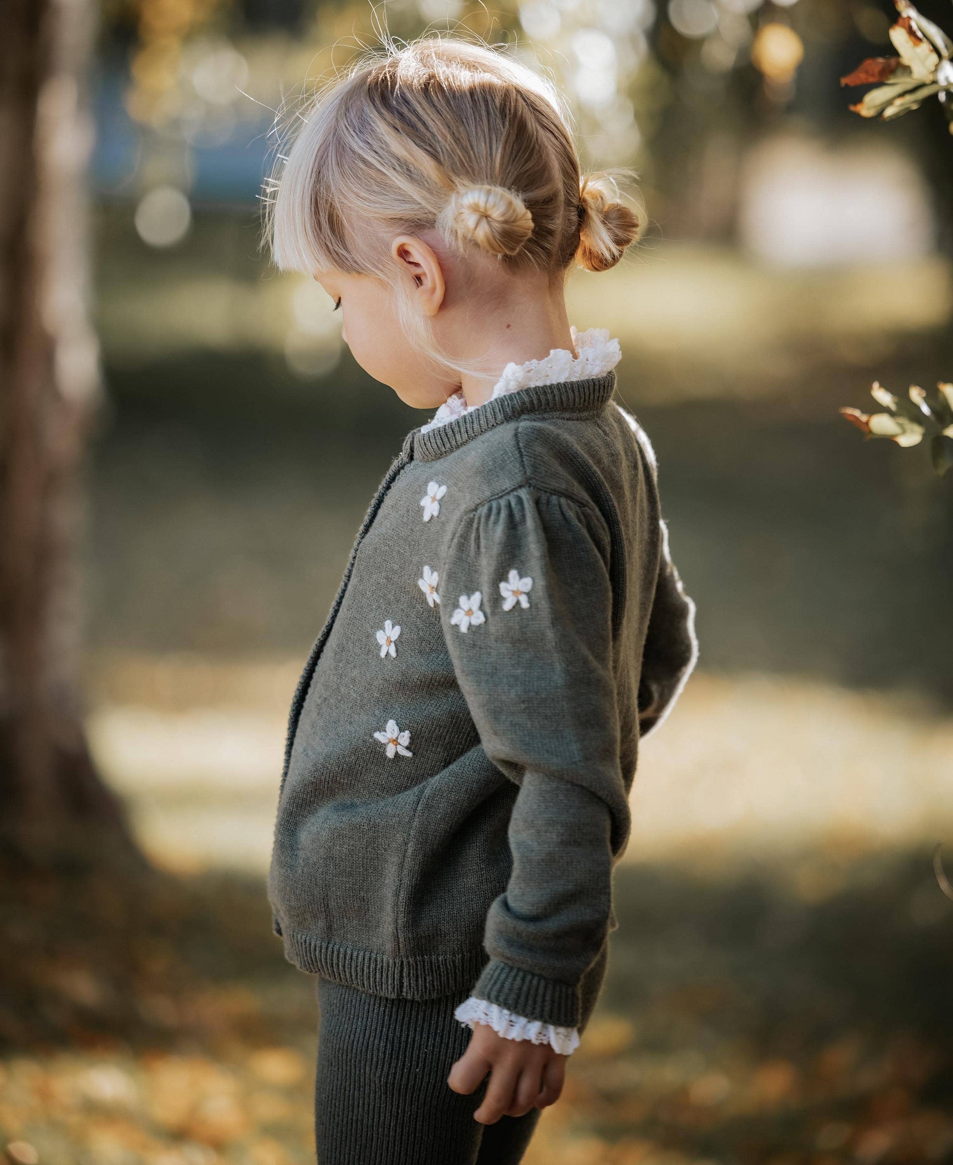 The cardigan has a sewn-on lace edge in both the neck and sleeve opening. In addition, there are hand-embroidered daisy flowers at the top of the cardigan, which help to give it a sweet look. The cardigan can be opened with buttons at the front. The cardigan has a basic and comfortable fit.