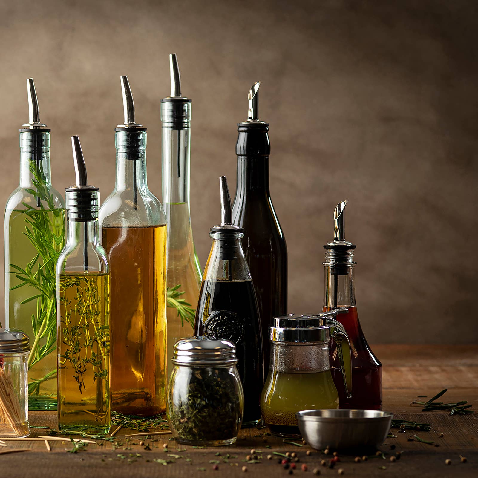 Contemporary glass bottle design adds style to any tabletop. Stainless Steel pourer allows for easy and consistent pouring.