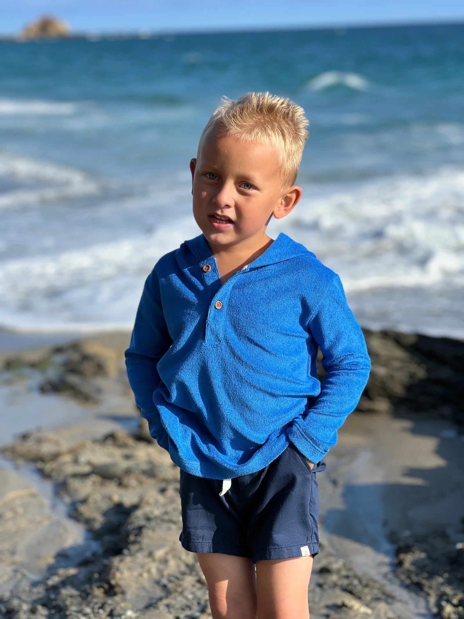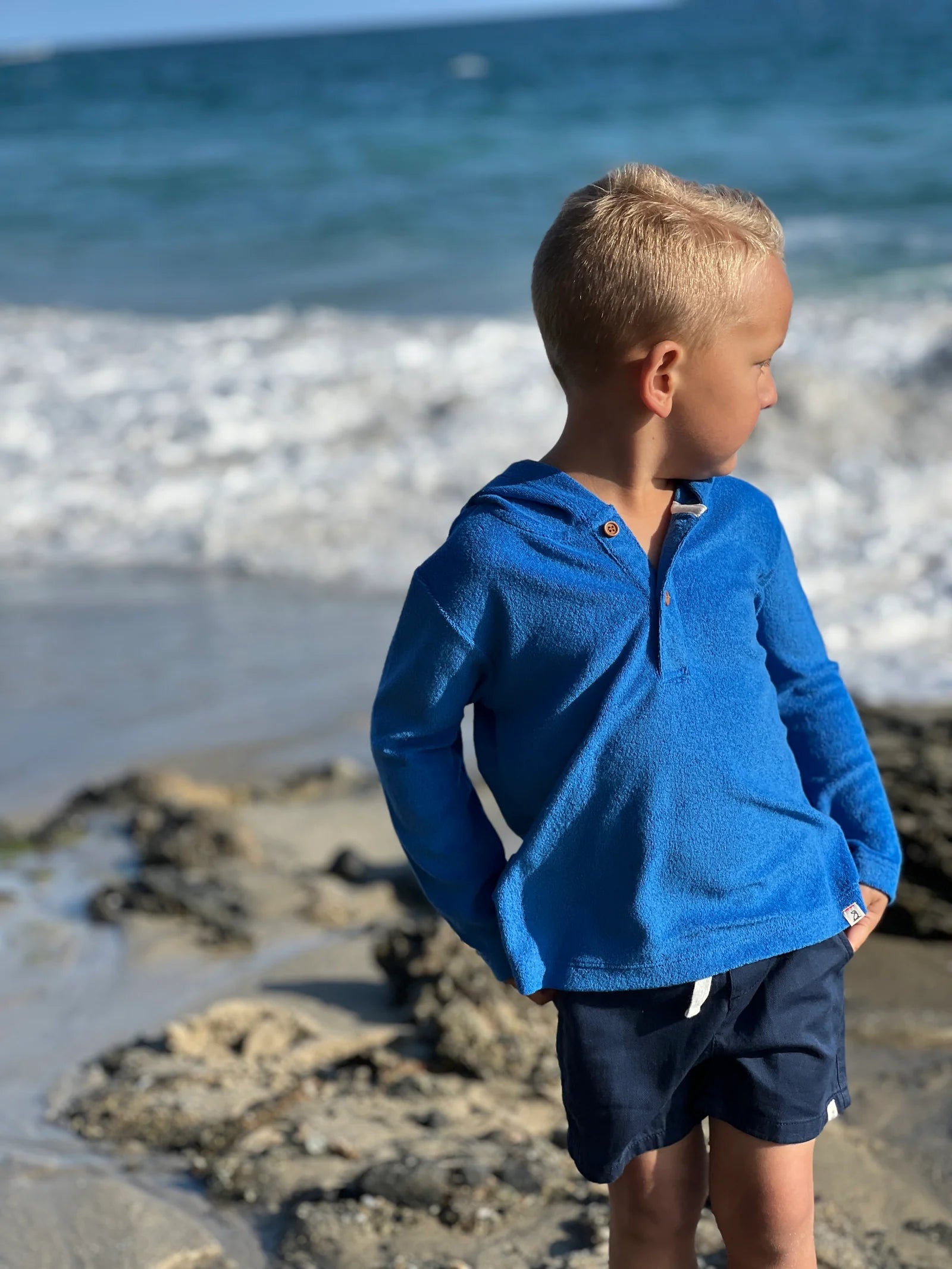 Stay comfortable and cool in our DEVON Terry Towelling Royal Hooded Top, it's perfect for the summer season. The royal blue color adds a pop of color, making it a stylish choice for kiddos. Keep them cozy and stylish all summer long.