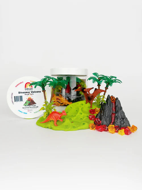 Includes: 8 oz Green (Watersmellon) KidDough, 2 Dinosaur Figurines, Volcano Figurine, Preshistoric Plants, Palm Trees, Red and Orange Lava Acrylics