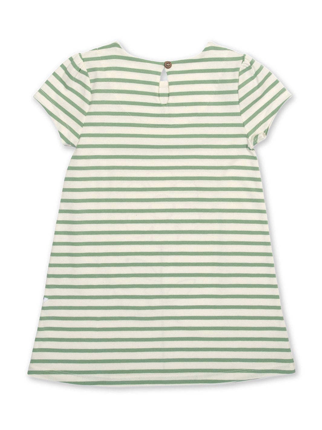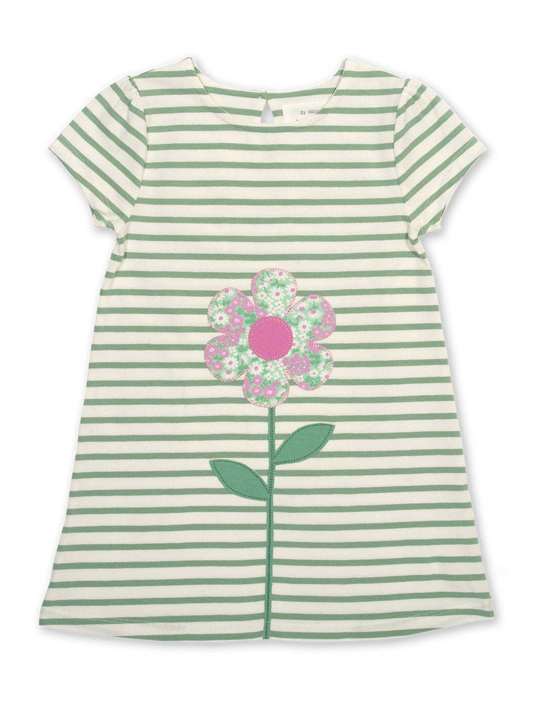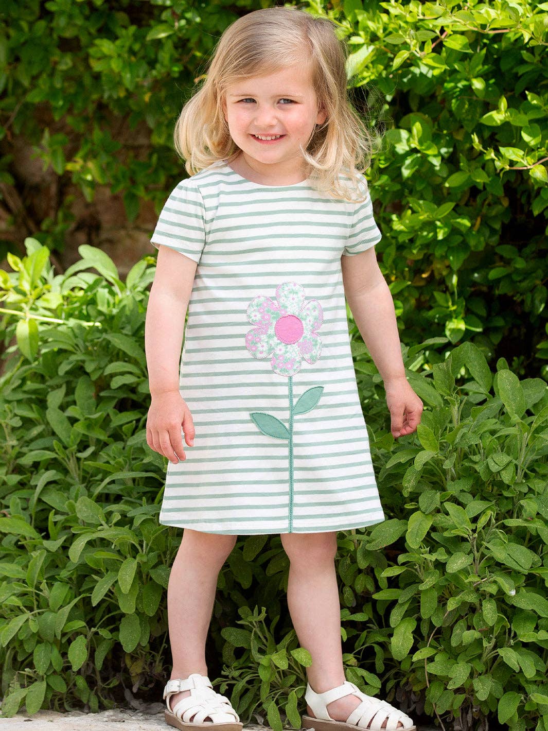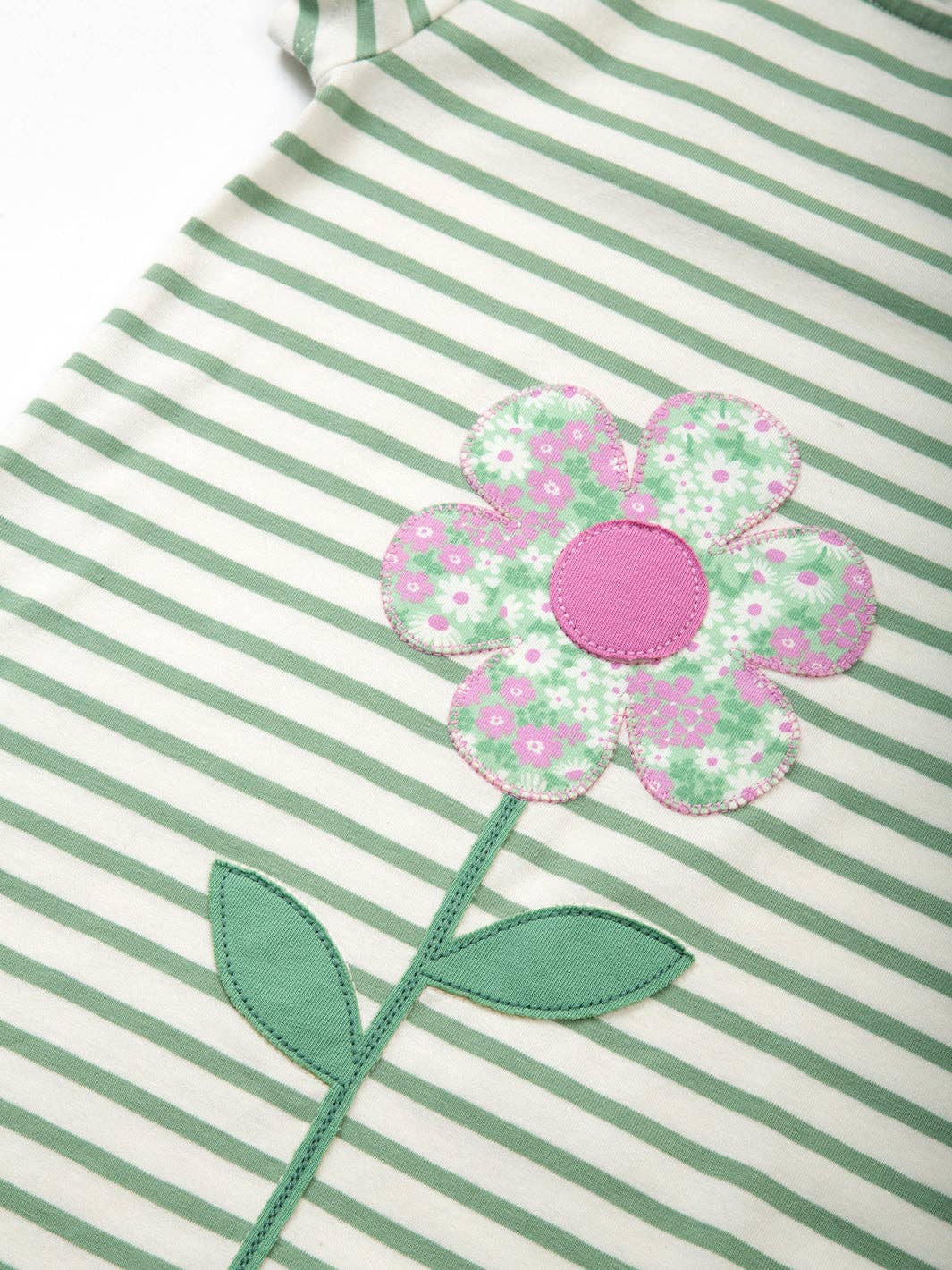 Hello flower! Starring a classic sage green and cream yarn dyed stripe and fab flower appliqué design that beautifully showcases our flower patch print. This A-line style with a coconut button keyhole back-neck opening ticks all the boxes for style and practicality. Made in soft organic cotton jersey with a little bit of stretch for great drape and next-to-skin softness.