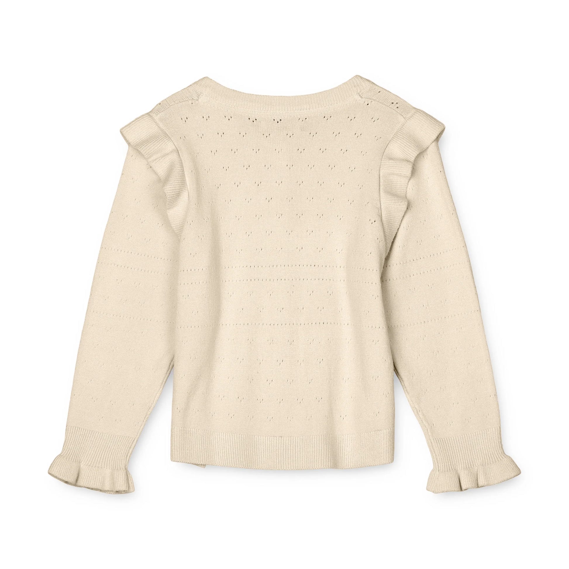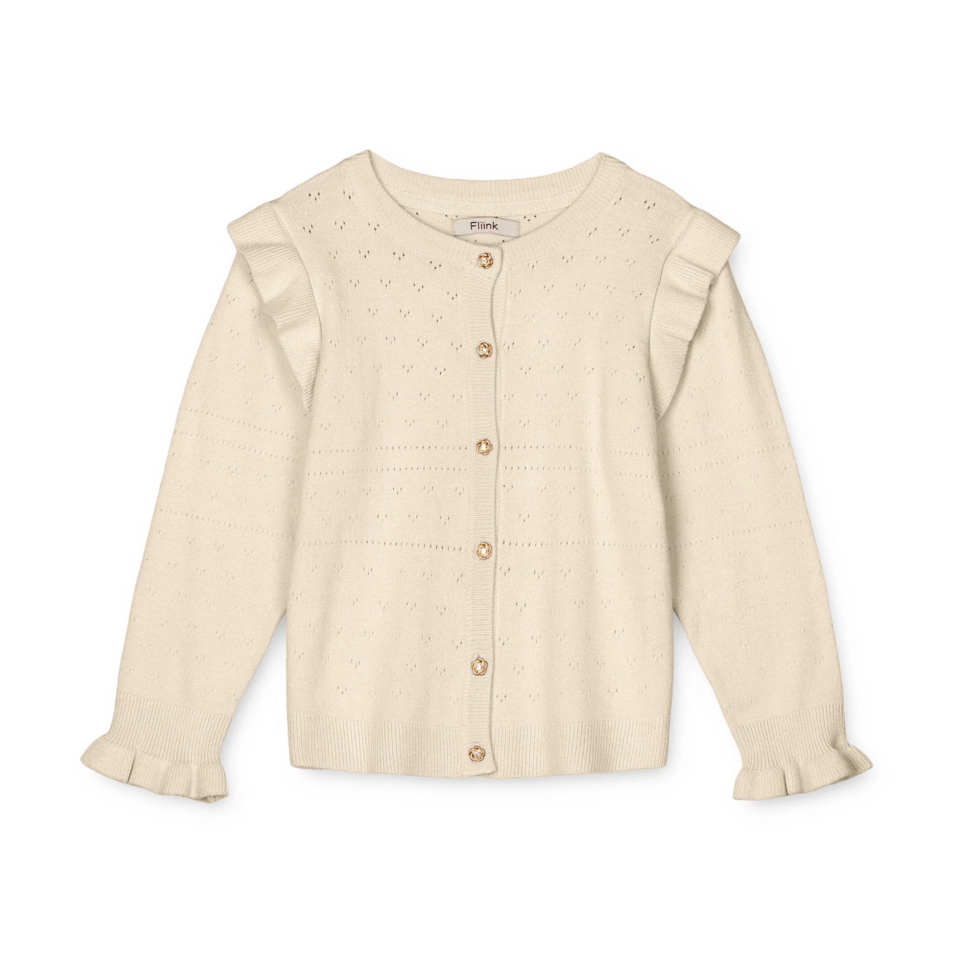 Pointelle-knitted cardigan in a soft and light quality. The cardigan has long sleeves with frill detail, round ribbed neck and ruffles on the shoulders. The cardigan closes with the finest gold buttons that have a stone in the middle.