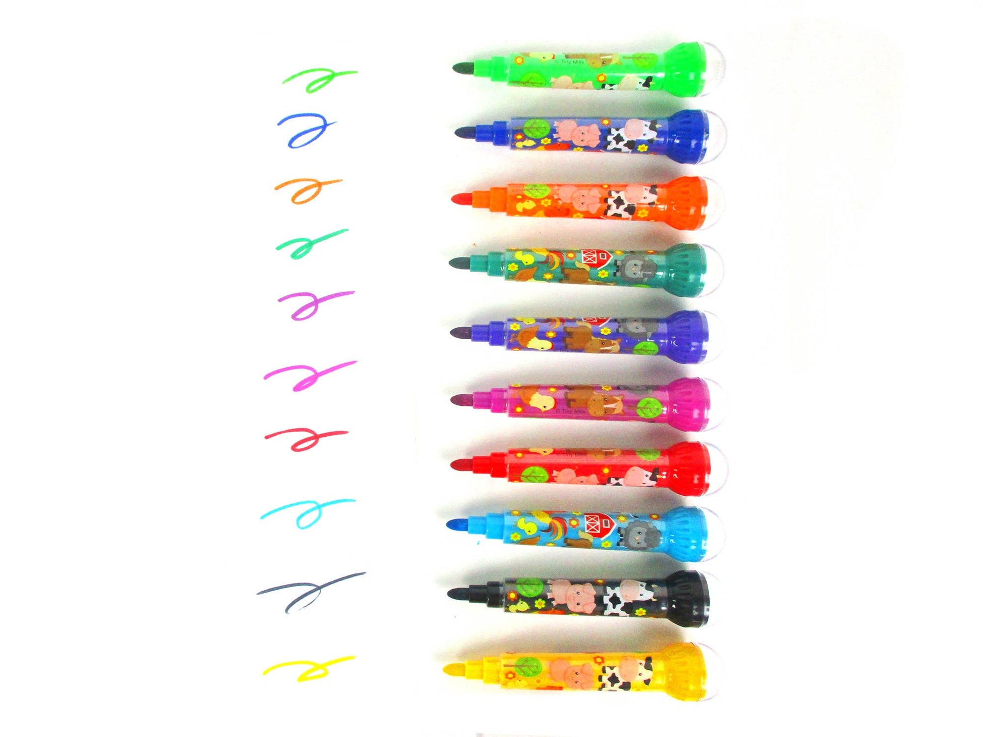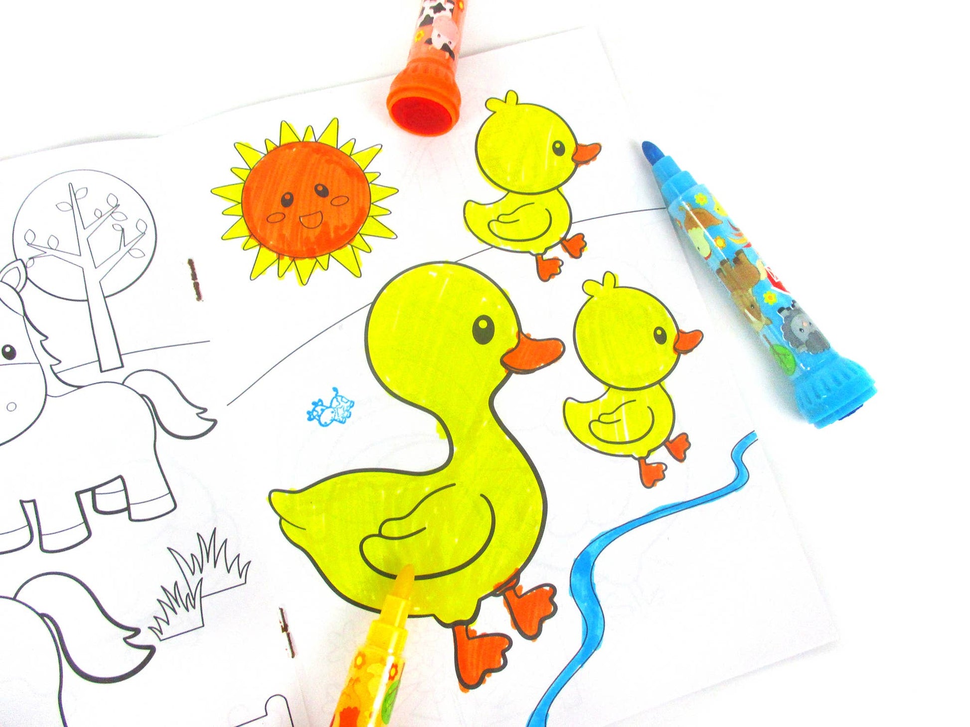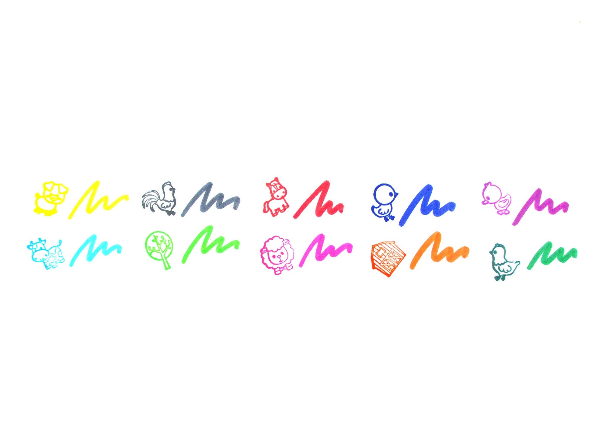 Our farm animals themed 2-in-1 stamp marker set comes with 10 different marker colors and 10 different farm themed designs.