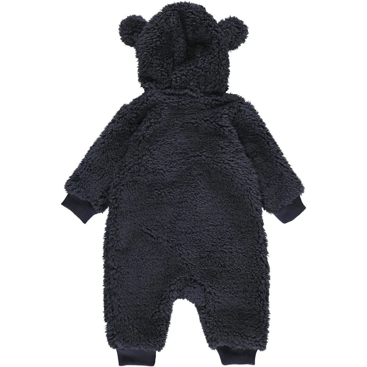 The suit has ribbed edges at the end at the legs, arms and hood.