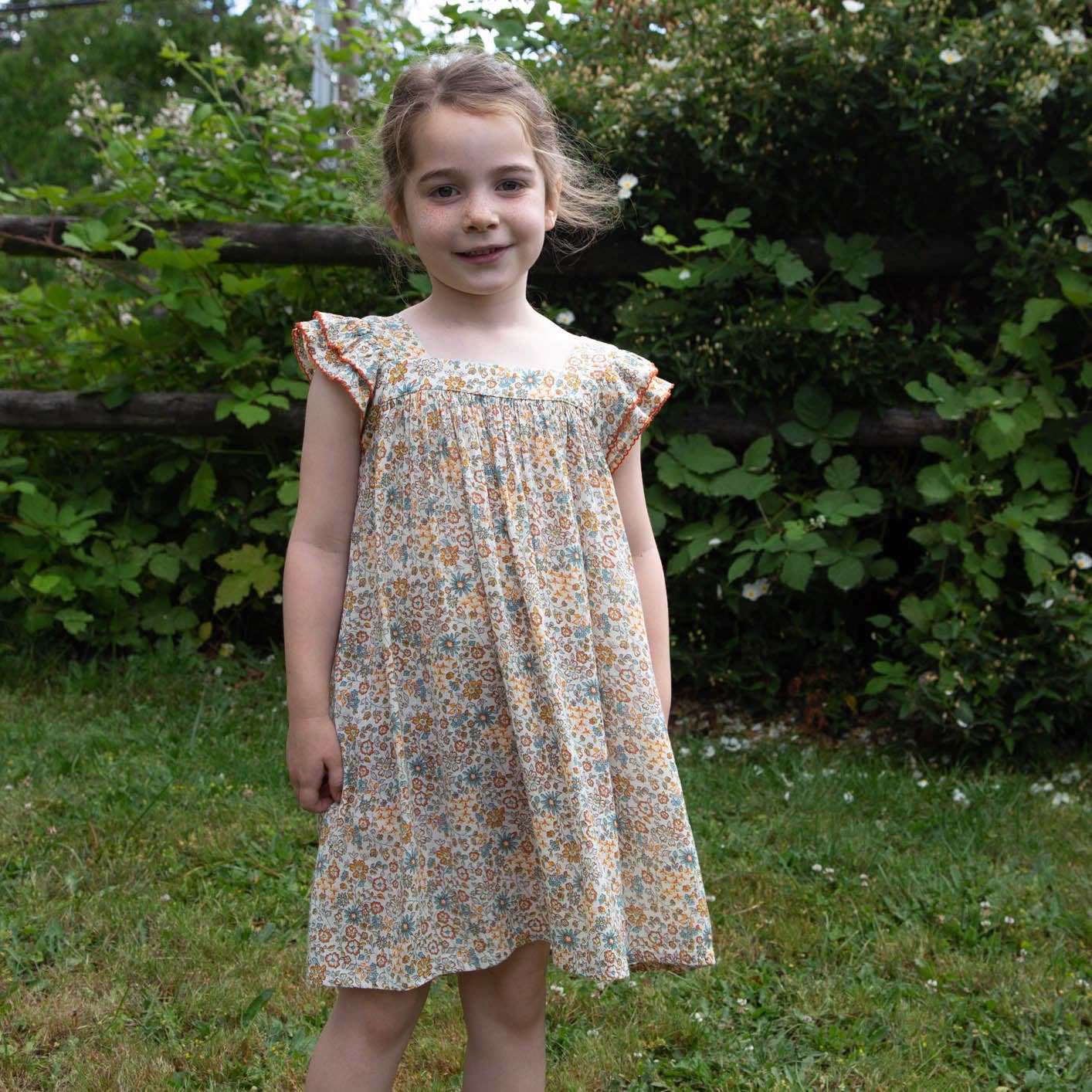 The standout feature is the double layers of flutter sleeves, beautifully finished with picoting trim, creating a sweet and dainty look. The A-line body of the dress offers a comfortable and flattering fit, allowing for ease of movement and play. Many gathers and lined body make it twirl worthy and perfect for special occasion and everyday wear.