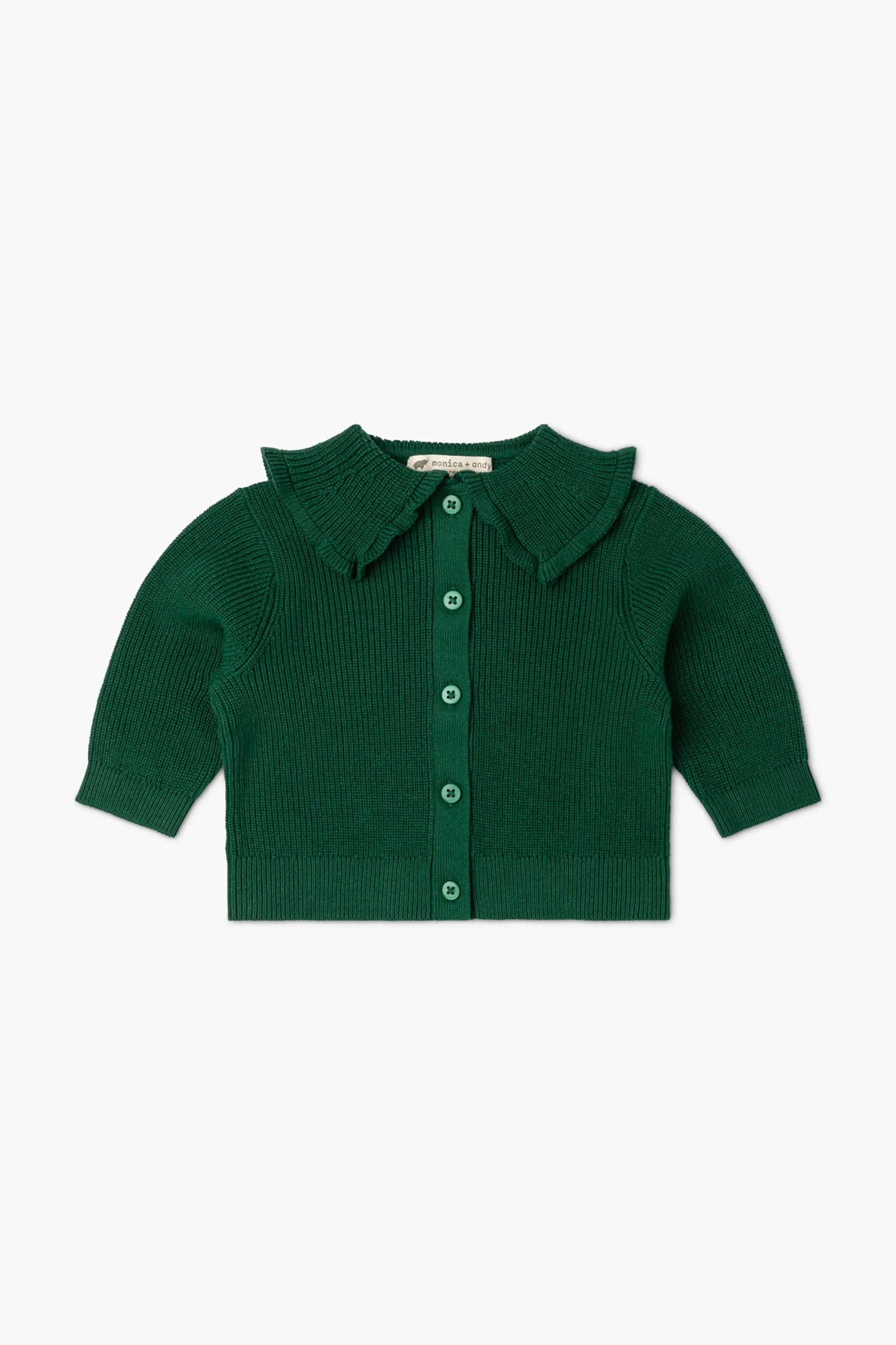 Made with 100% organic cotton, our Ruffle Collar Cardigan has functional buttons down the front.