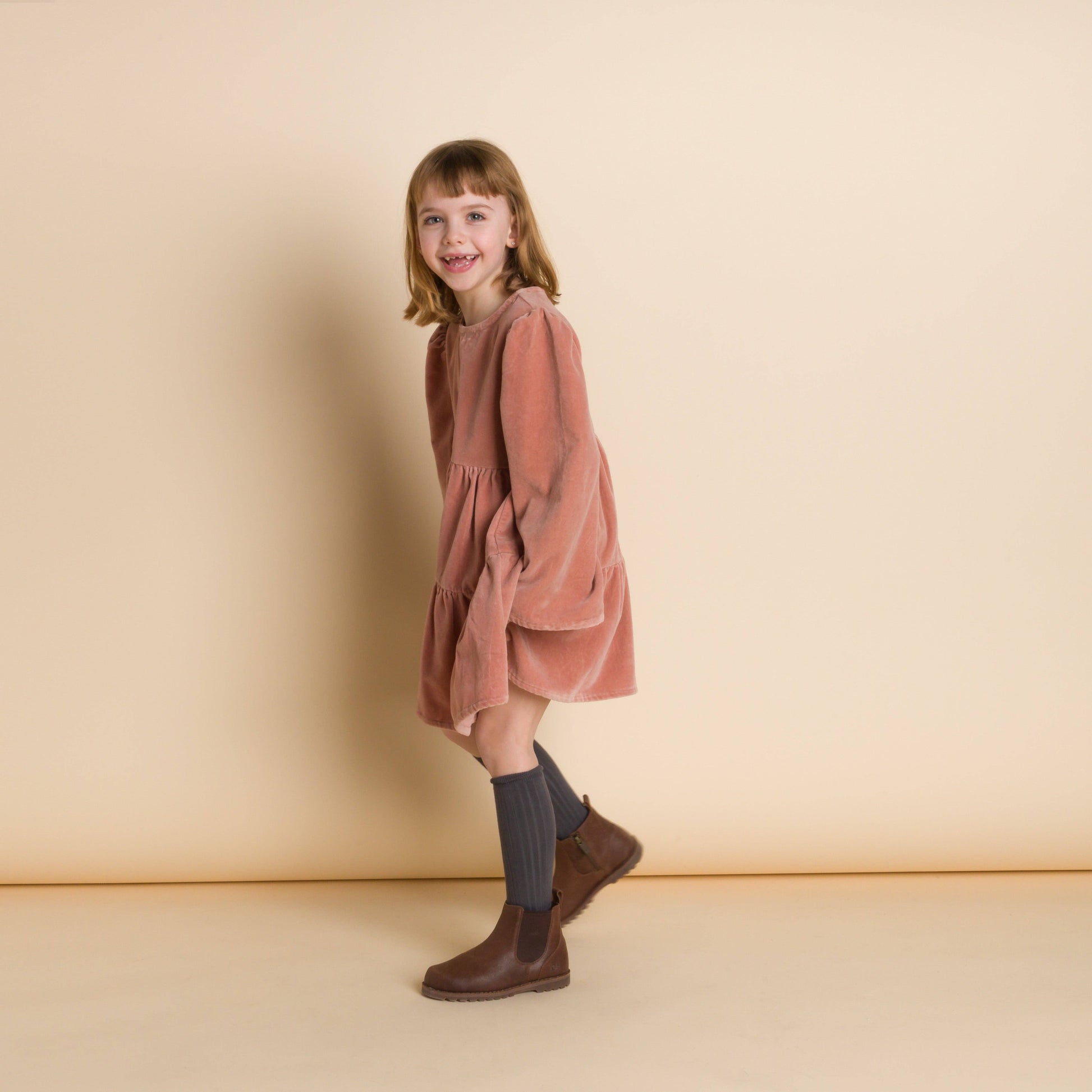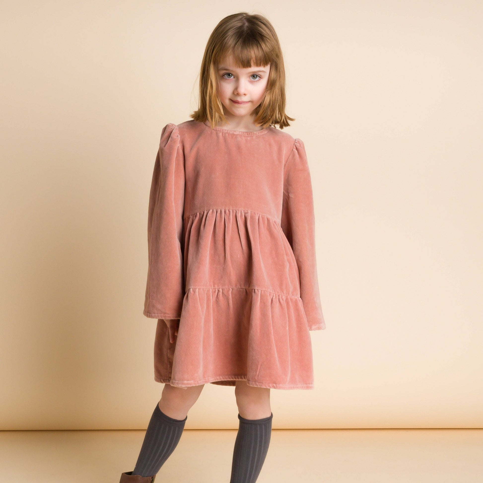 In a beautiful blush, luxe cotton velvet, the Holly dress is certain to be a holiday favorite!