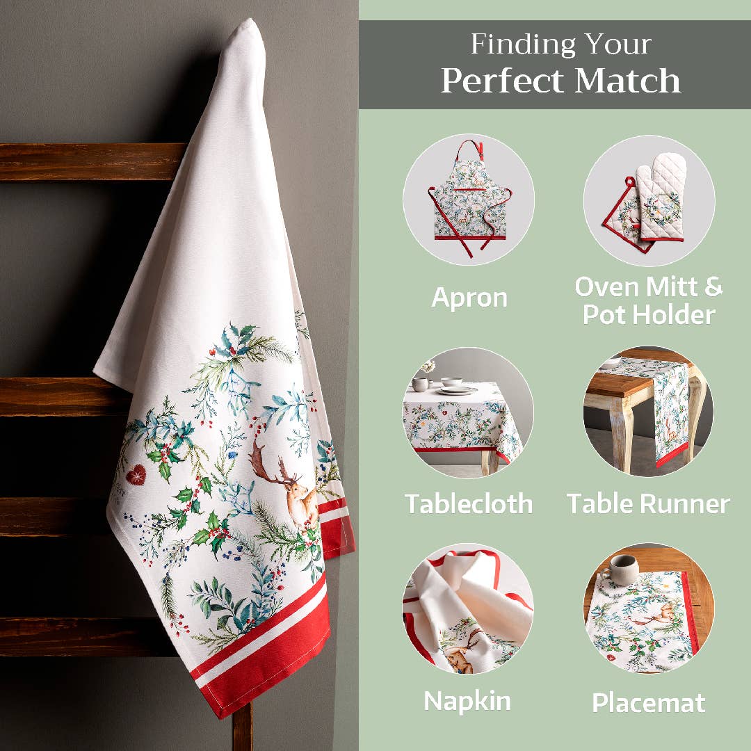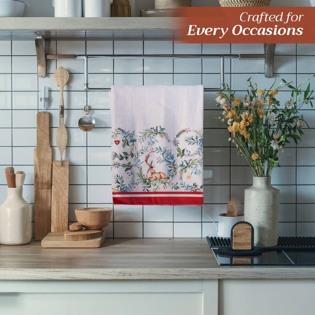 Made from 100% cotton, this set includes three kitchen towels, each with a unique holiday design and measuring 20 by 27.5 inches — perfect for drying dishes, baking treats, or adding a joyful touch to your holiday home.