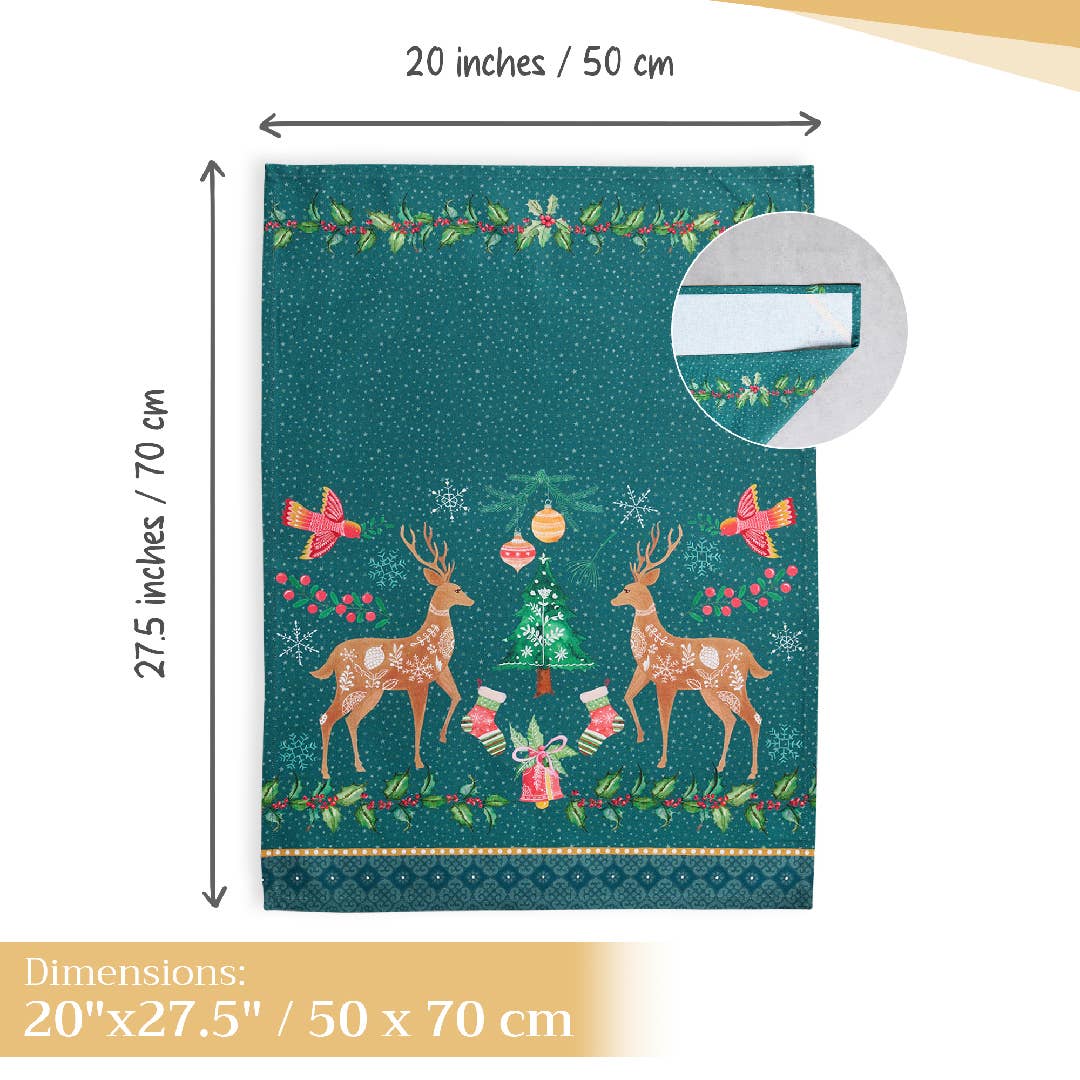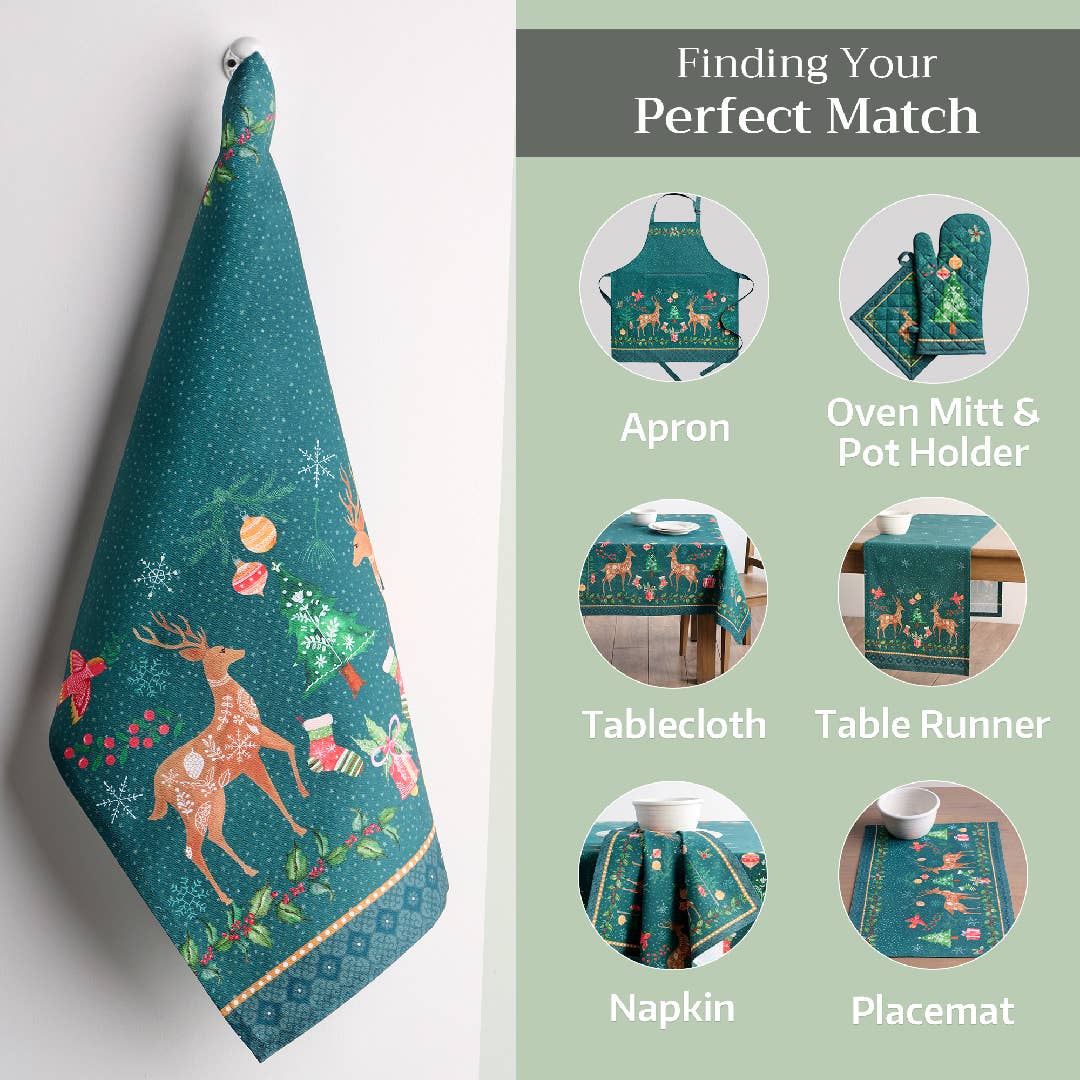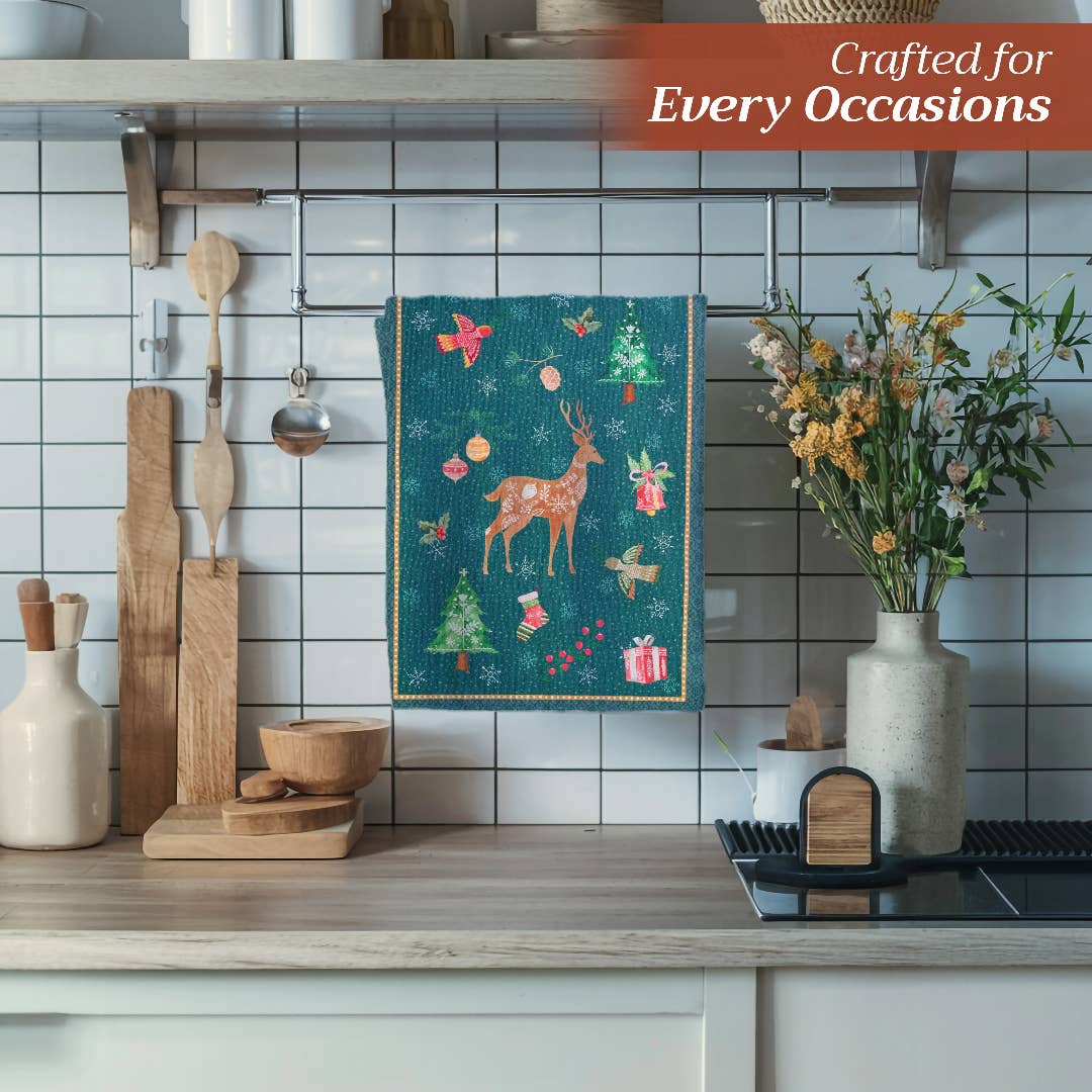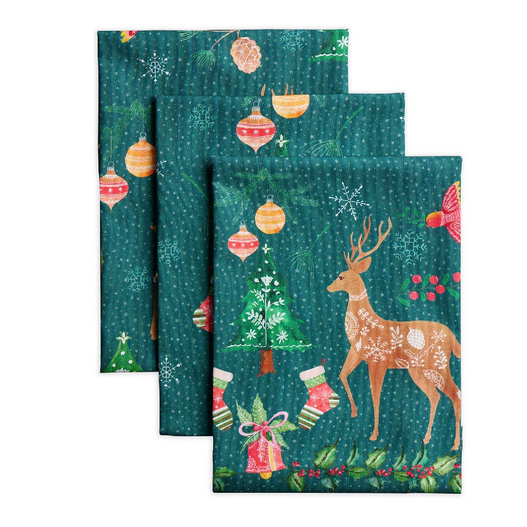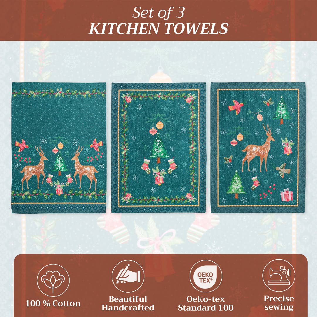 Made from 100% cotton, this set includes three kitchen towels, each with a unique holiday design and measuring 20 by 27.5 inches — perfect for drying dishes, baking treats, or adding a joyful touch to your holiday home.