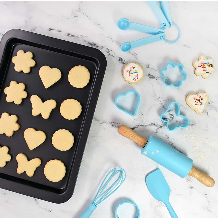 Includes an assortment of 12 kitchen essentials, great for family baking projects. Made with no hassle, non-stick, easy-to-clean, food-grade materials. Designed for all ages to make baking easy and fun for everyone!