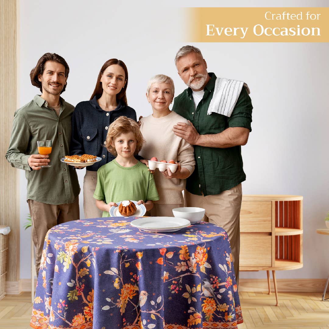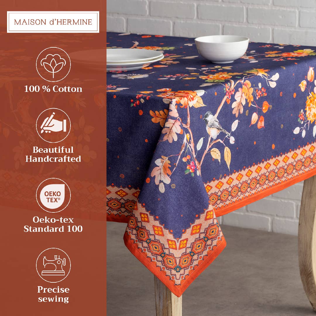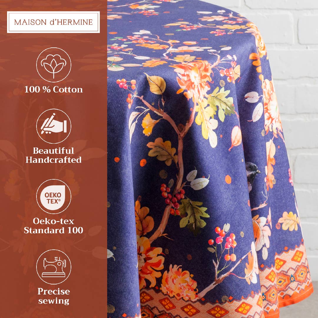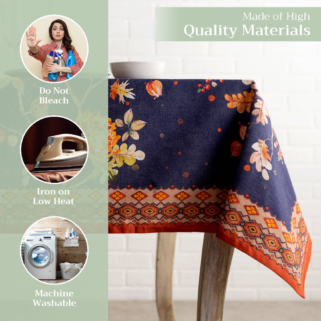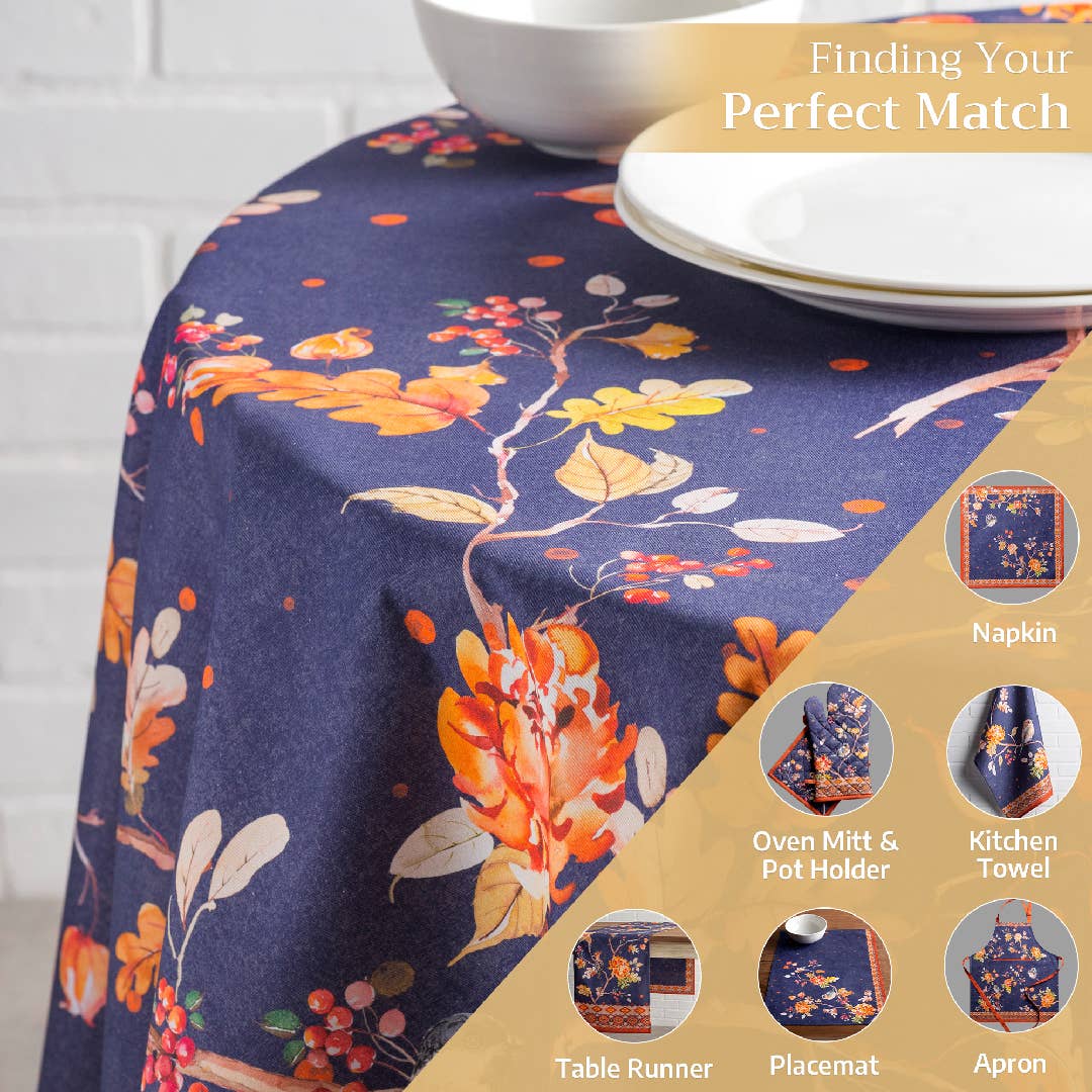 Made from 100% cotton, this tablecloth is available in rectangle, square, and round shapes — perfect for setting a warm, inviting table for Thanksgiving dinners and seasonal gatherings.