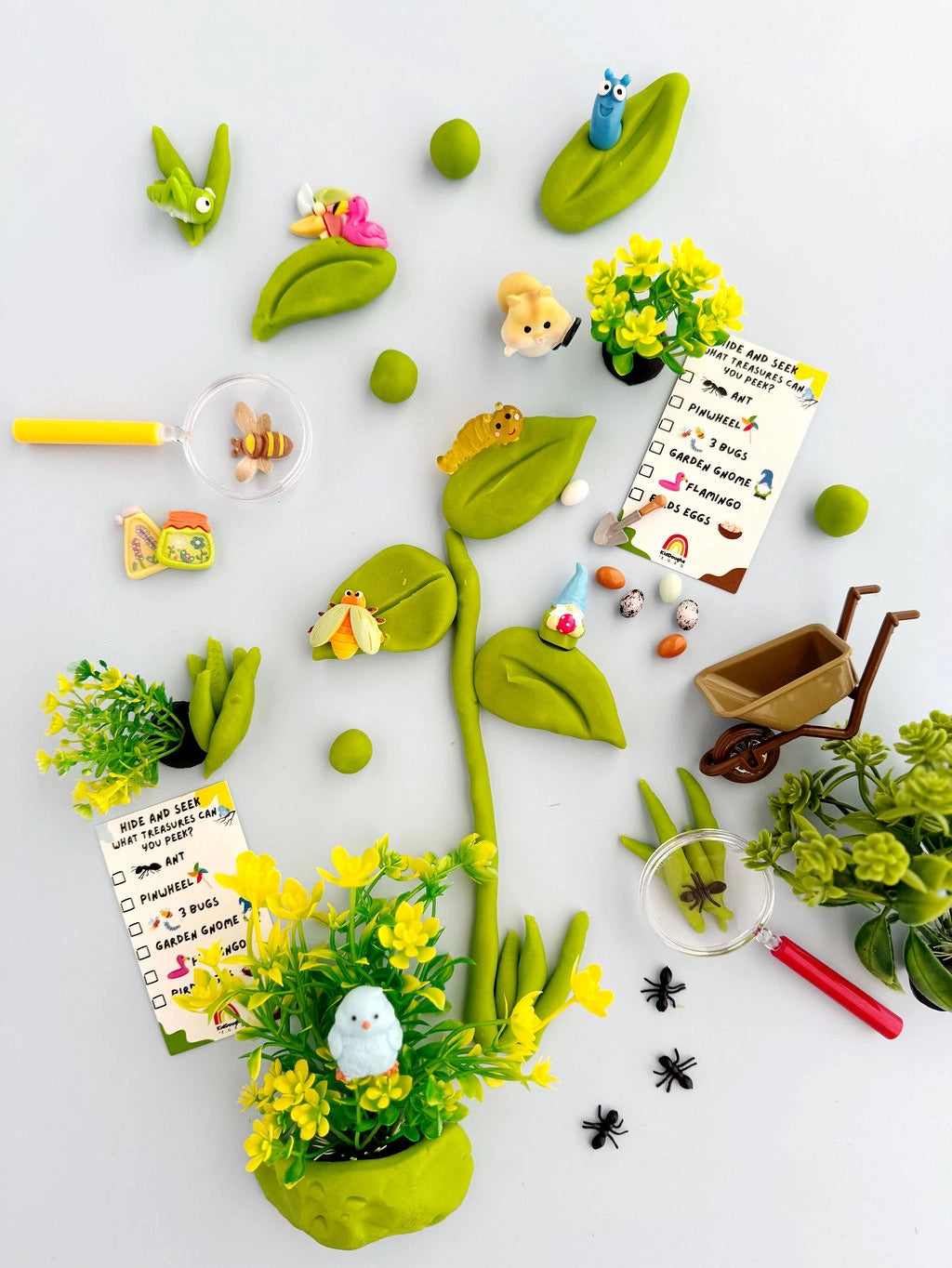 Includes: 8 oz Green Apple Scented Dough. Leaf boredom behind with a small world sensory play game! Take turns creating a mini outdoor landscape, then hide and discover backyard treasures like bugs, garden gnomes, and curious critters. Let your imagination blossom as you explore the wonders of nature through hands-on play!