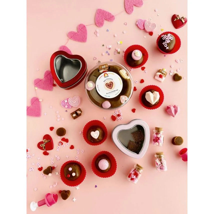 Includes: Includes one 8 Ounce jar of Milk Chocolate Scented KidDough with an assortment of chocolate charms, embellishment charms, candy box charm, heart shaped candy window box, 2 plunger cutters, silicone candy tin liners, and jars of assorted Valentine's clay sprinkles and glitters.