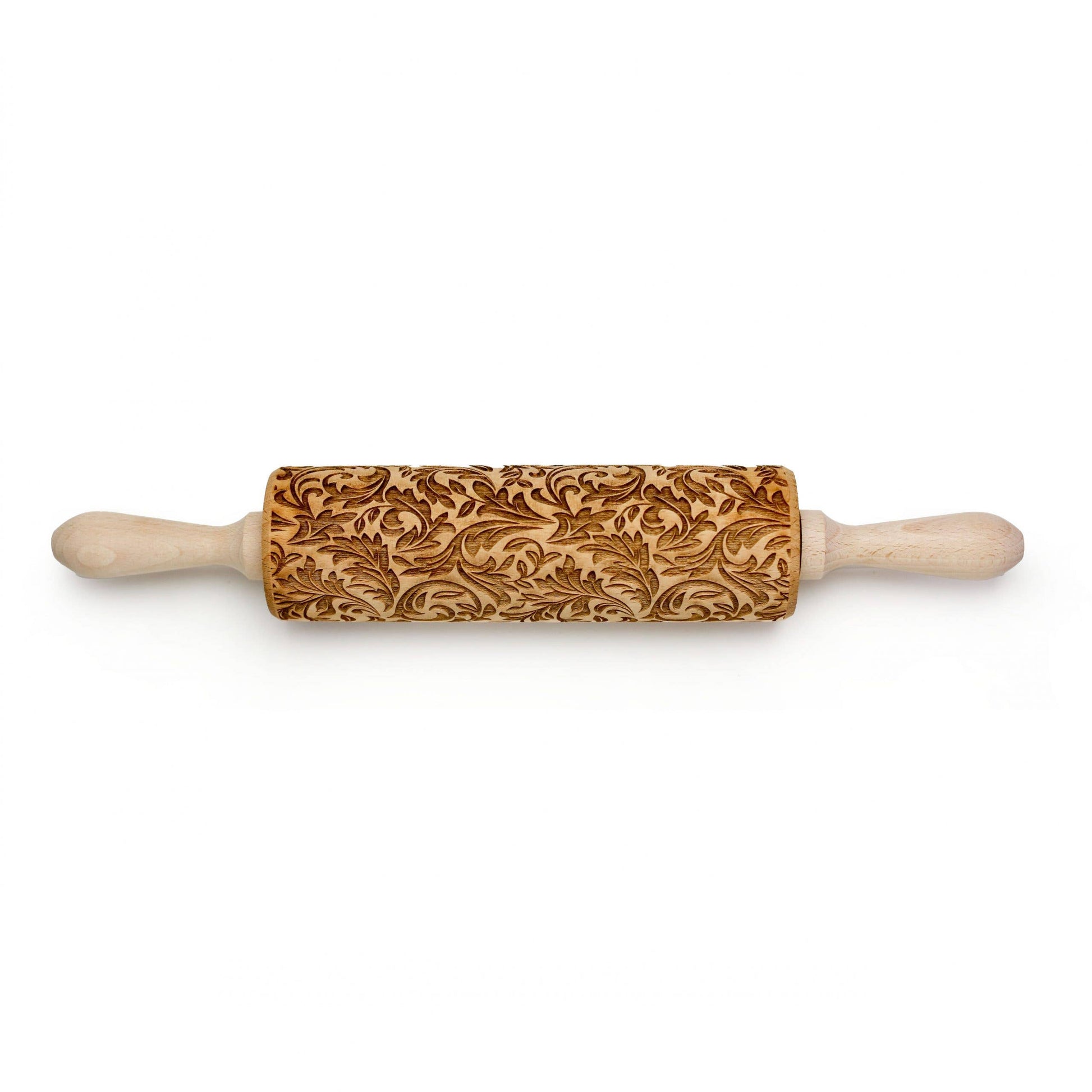 A leaf patterned embossing rolling pin, great for making pastry or clay.