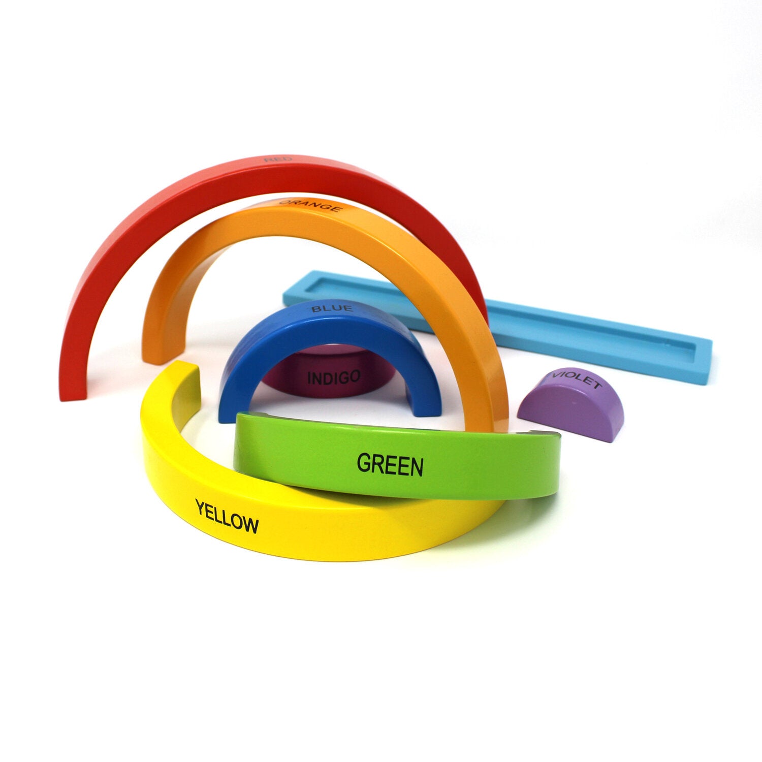 Learn the seven colors of the rainbow with these sturdy wooden rainbow colored blocks that stack many ways! You will see that each color is identified on each arc piece for learning colors and developing sizing & coordination skills.