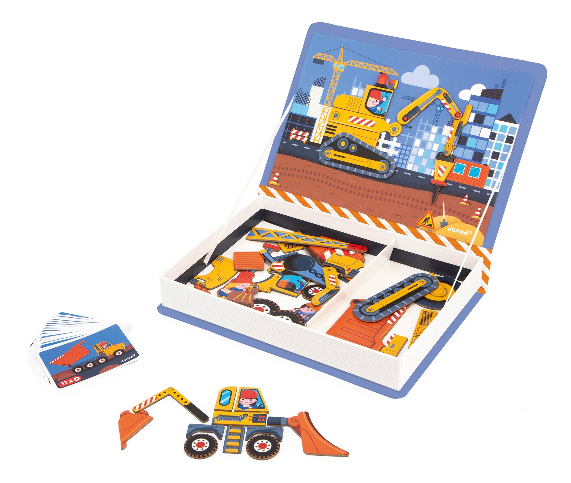 This magnetic game consists of 50 magnets and 18 cards. The aim of the game is to recreate the vehicles on the magnetic board by following the templates on the cards. As a result, children will be able to reproduce the ever-popular construction crane, in addition to a bulldozer, jackhammer or digger!