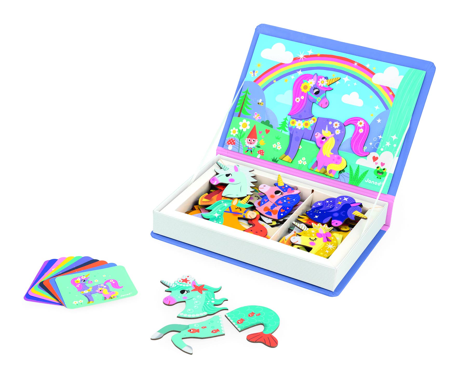 Welcome to the fantastic and enchanting world of unicorns! This magnetic toy comprises 44 magnets and 10 cards.