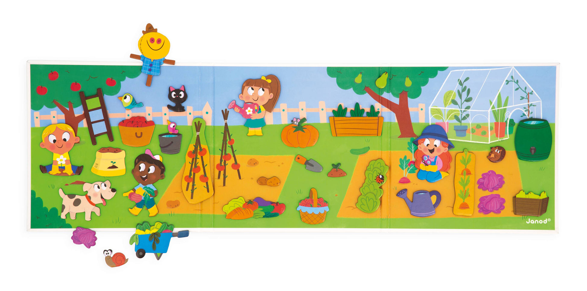 This book contains 30 magnets representing fruit, vegetables, animals and tools, so you can come up with countless stories.