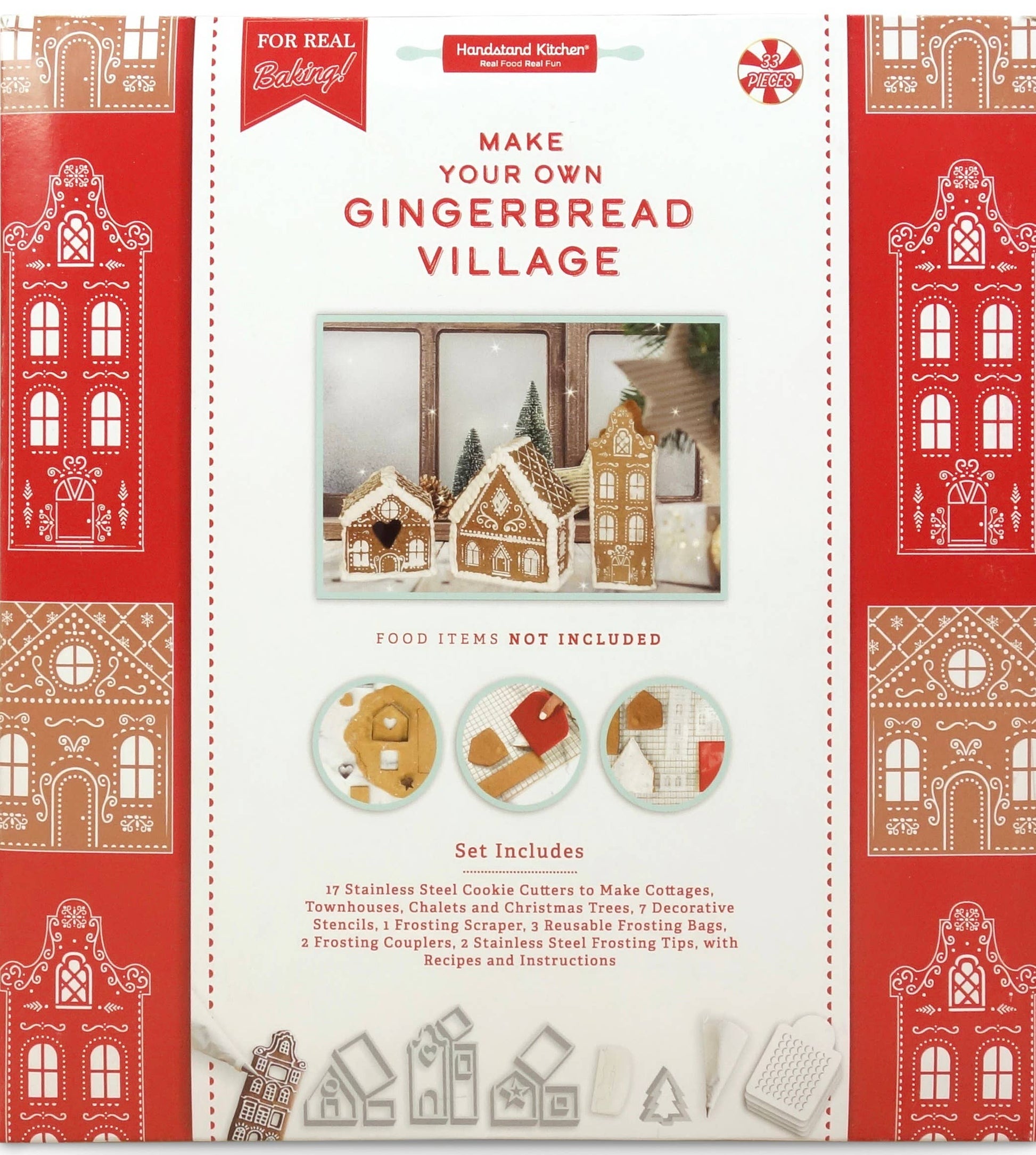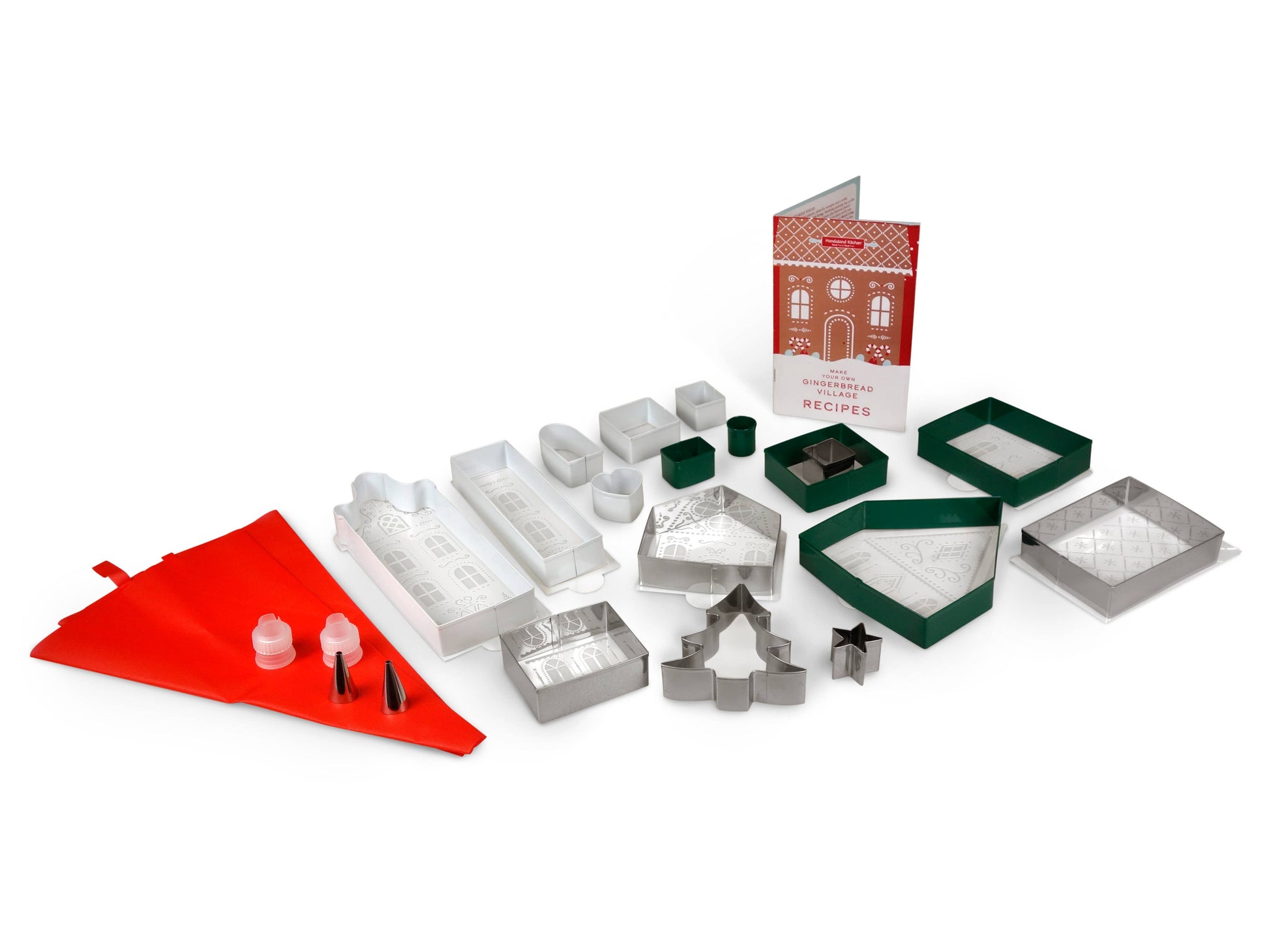 This deluxe 34 piece set has all the tools needed to bake your own gingerbread cookies in shapes that create a complete holiday village of sweets!