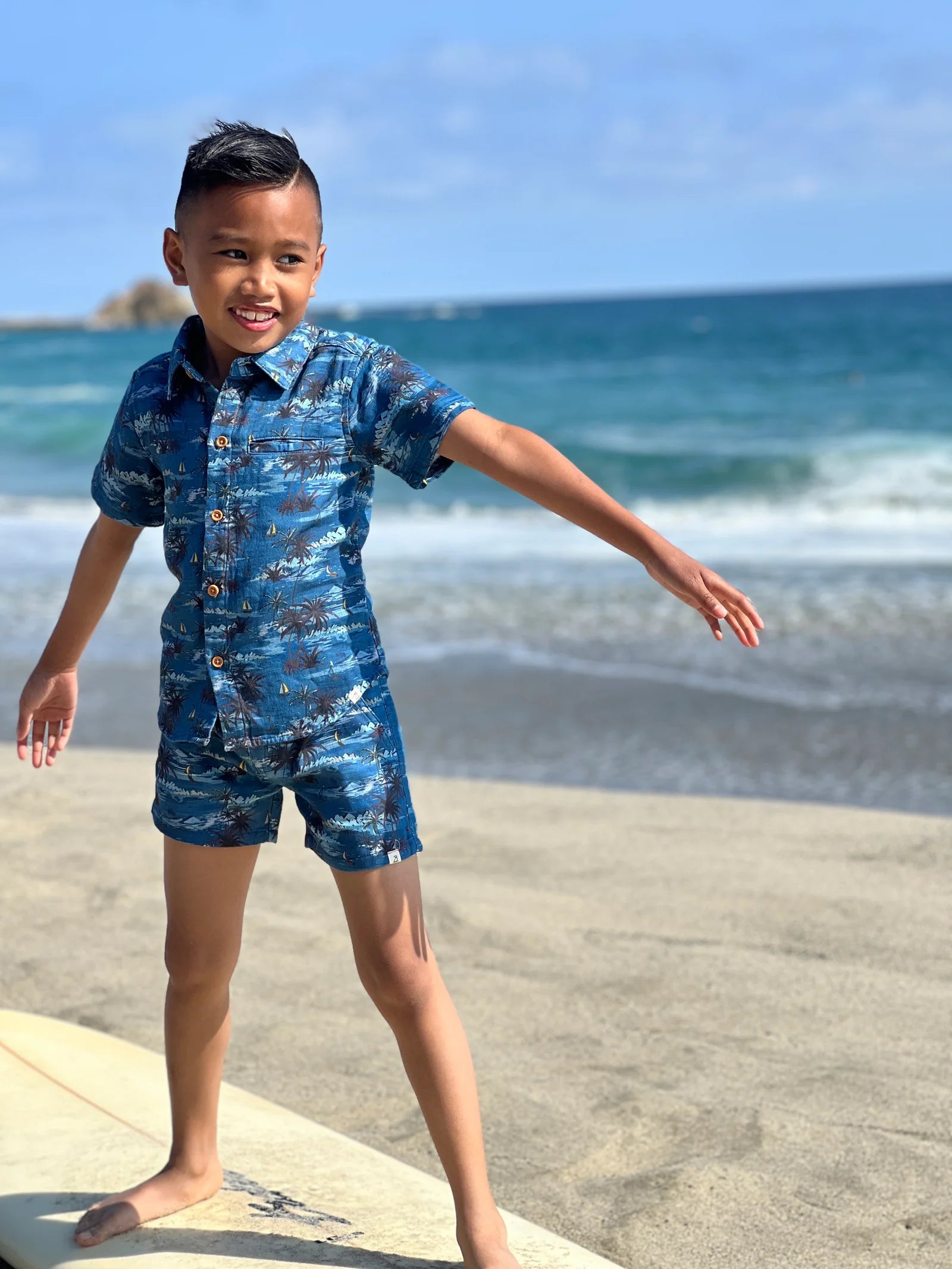 Add a tropical touch to your summer wardrobe with our Maui Blue Hawaiian Print Woven Shirt. The vibrant print will give you a laid-back island vibe no matter where you go. Embrace the summer season with this must-have addition to your child's closet.