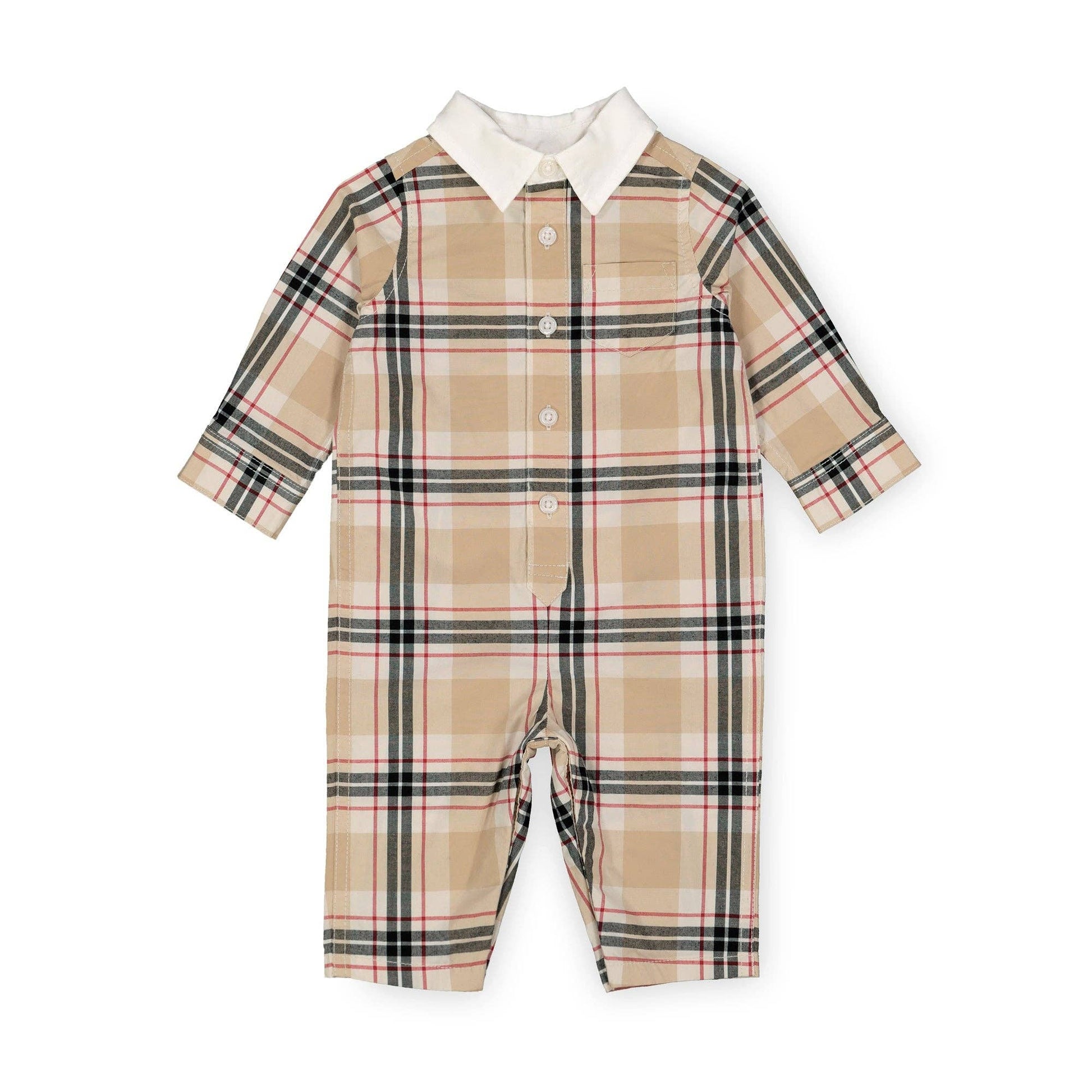 Thanks to our signature plaid poplin, our long sleeve woven one-piece will get your little guy dressed up for the holidays in style.