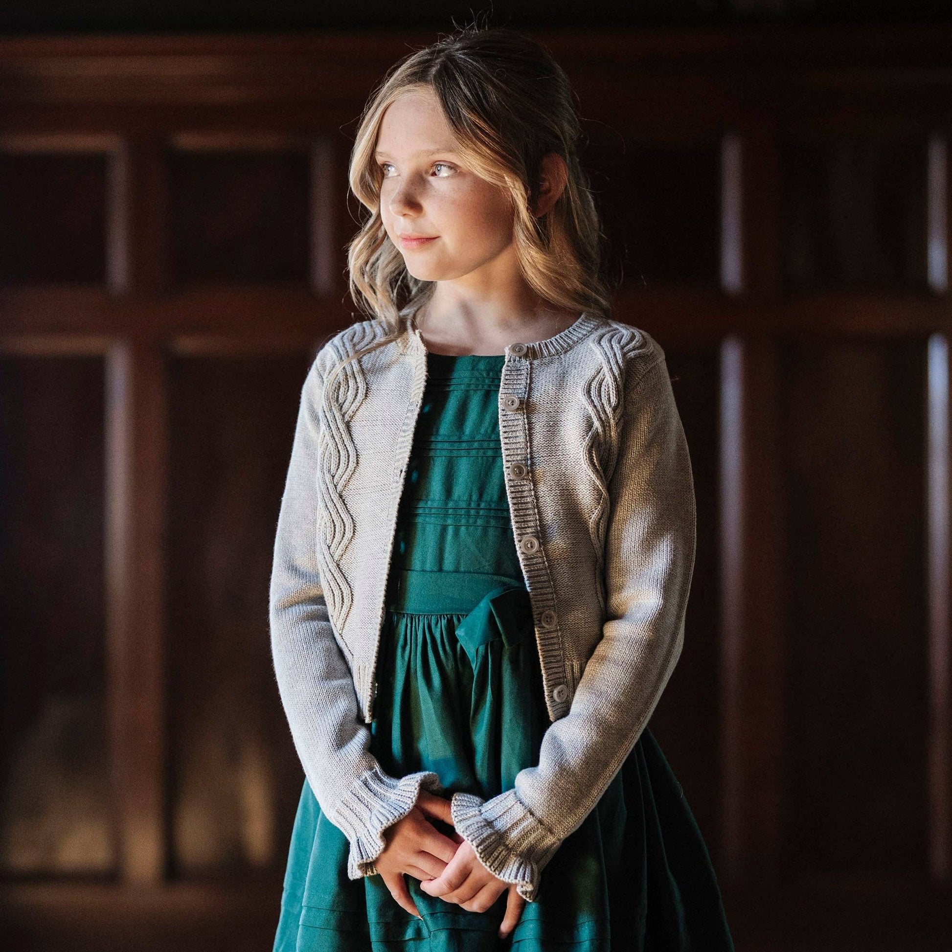 A beautiful layer to top off her dressy outfits. Our cropped cardigan sweater features a beautiful cable design, feminine ruffle cuffs, and a button closure at the center front. Crafted from soft organic cotton for a perfect blend of comfort and style.