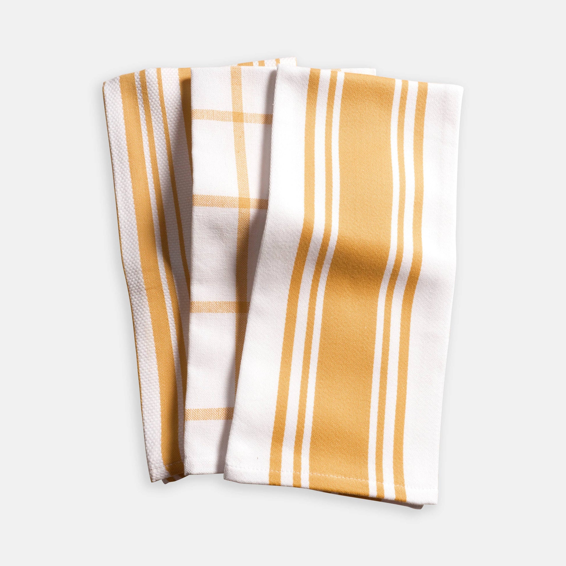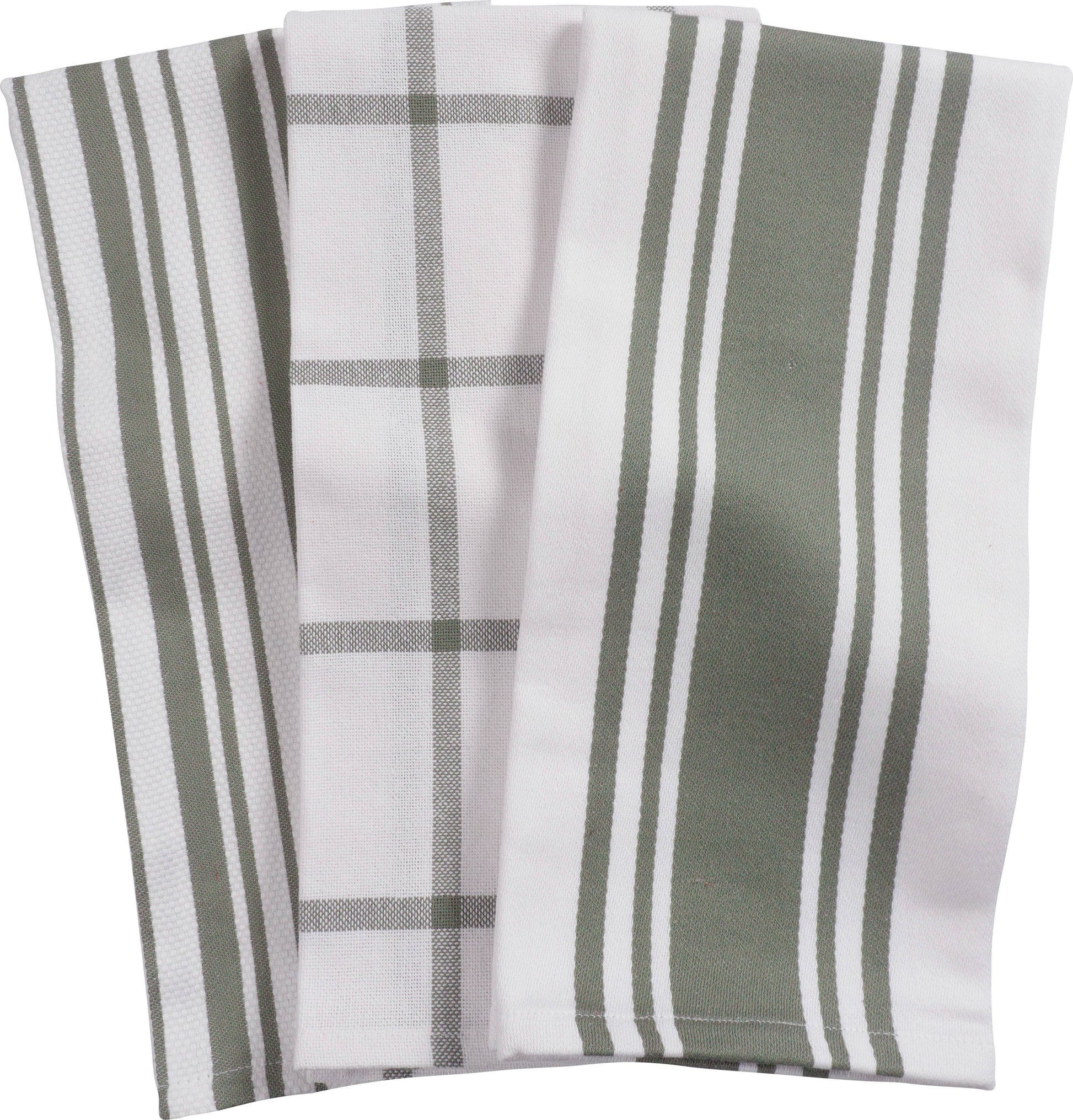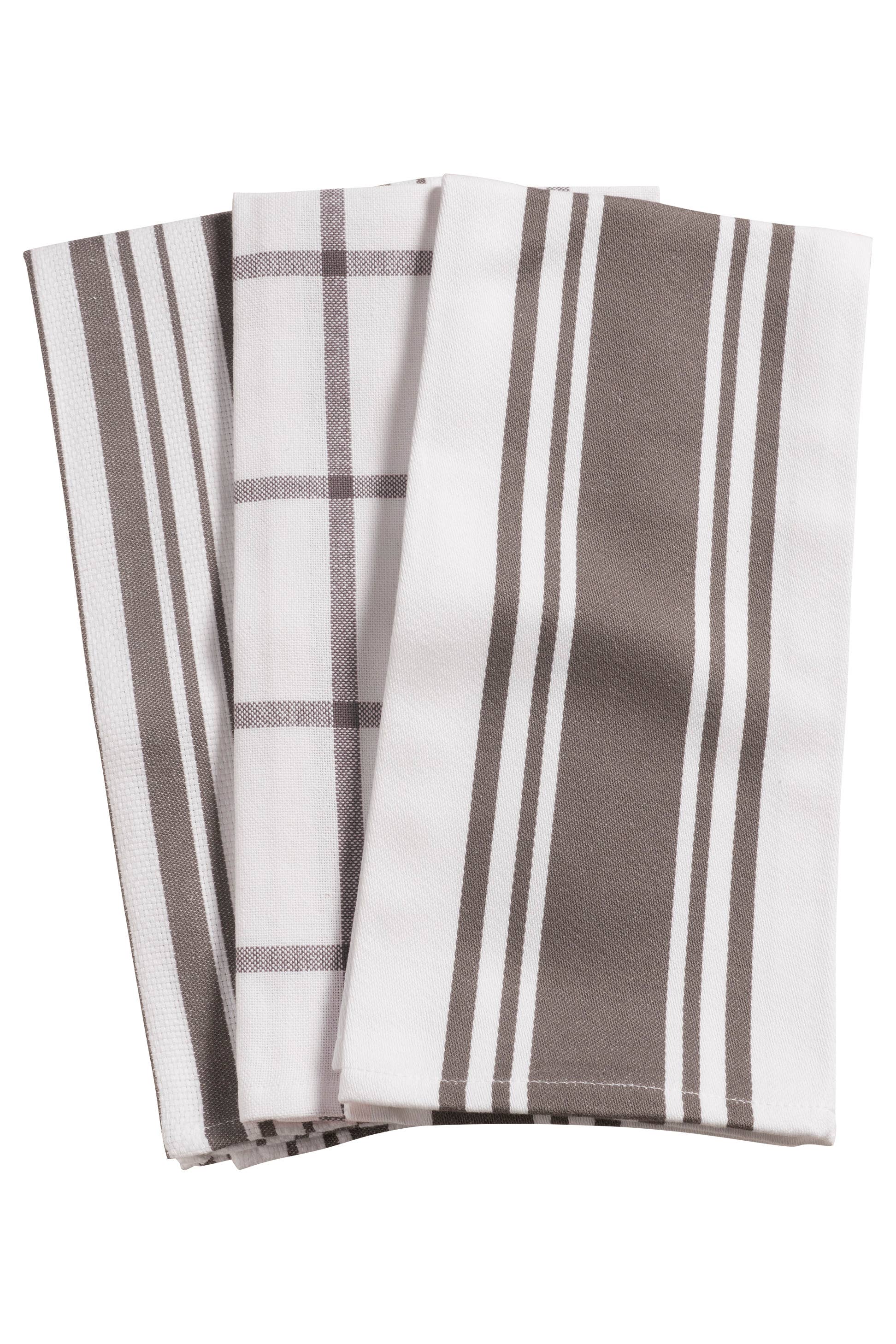 This combination set of three kitchen towels features one center band towel, one windowpane towel, and one basket weave stripe towel.