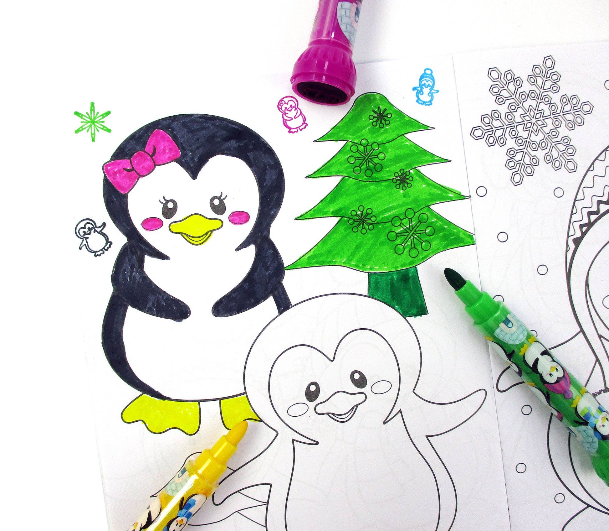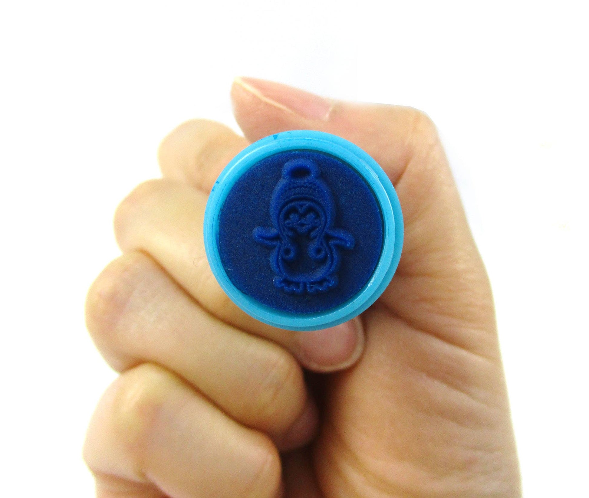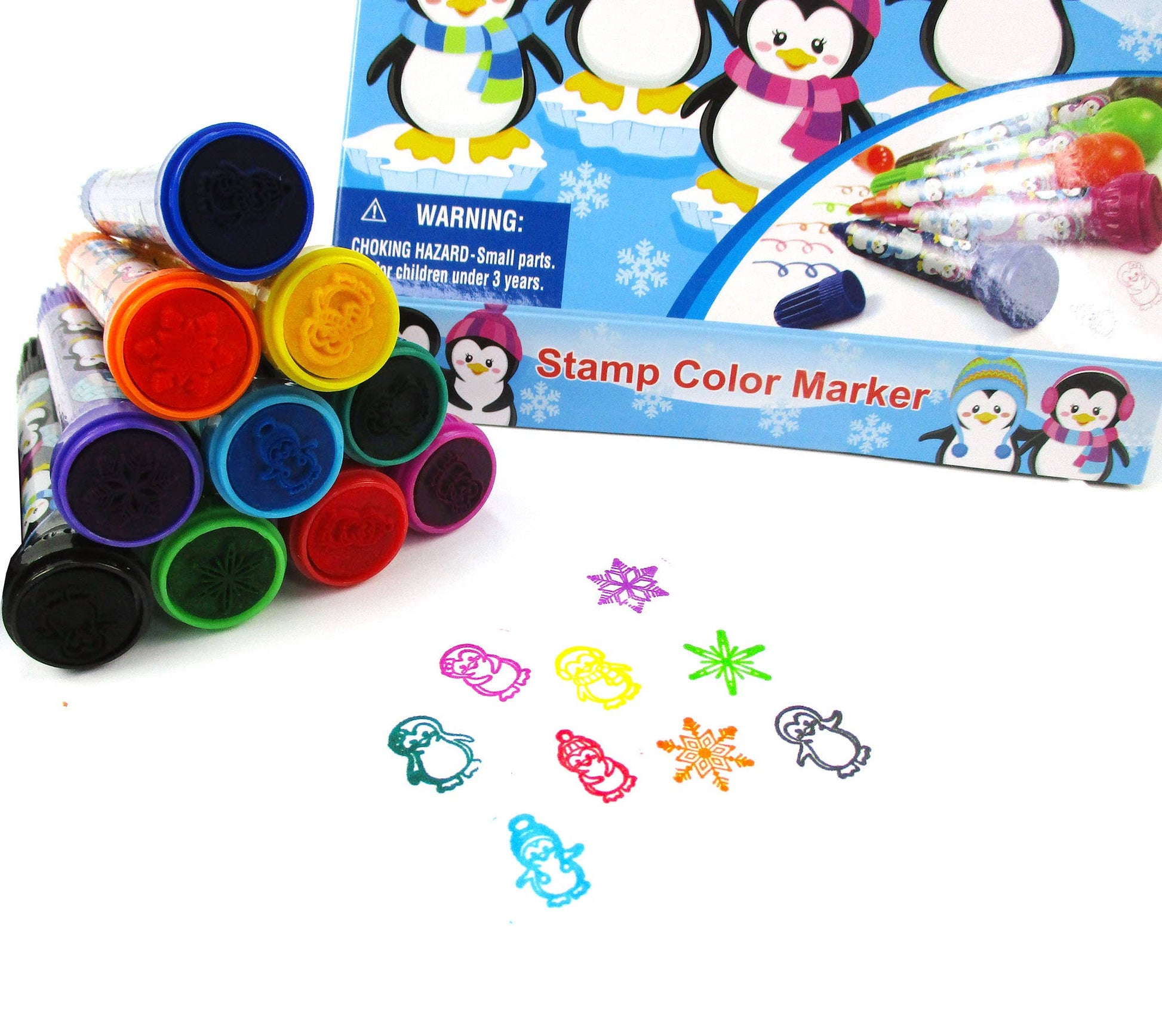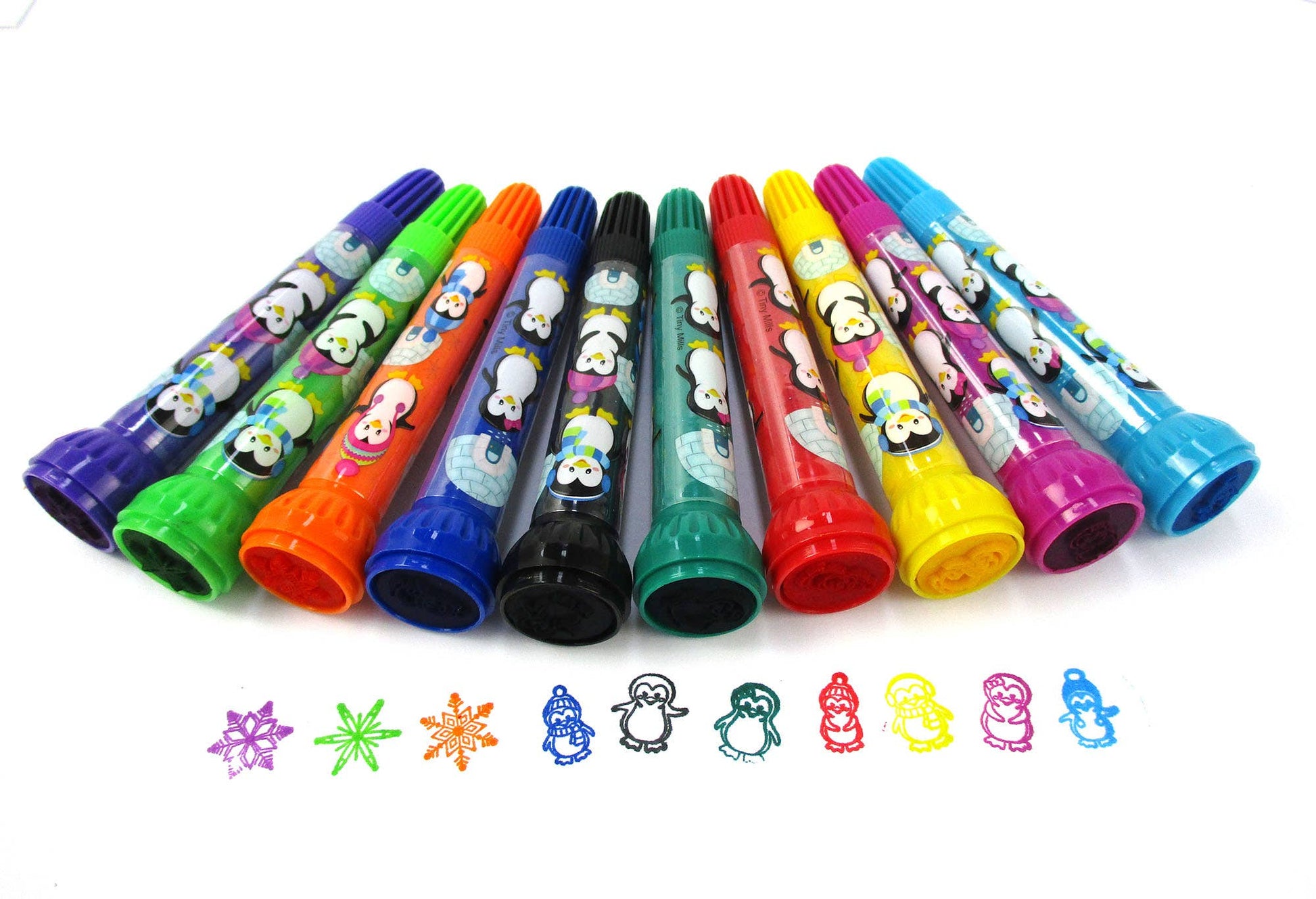 Our penguin themed 2-in-1 stamp marker set comes with 10 different marker colors and 10 different penguin themed designs.