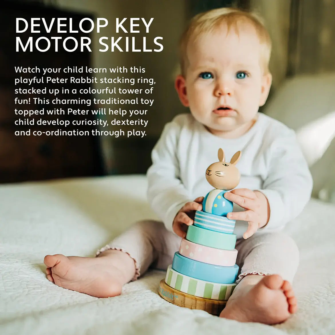 This traditional wooden stacking ring is the perfect toy for toddlers. Painted in beautiful pastel colours and patterns, with Peter sitting on the top!
