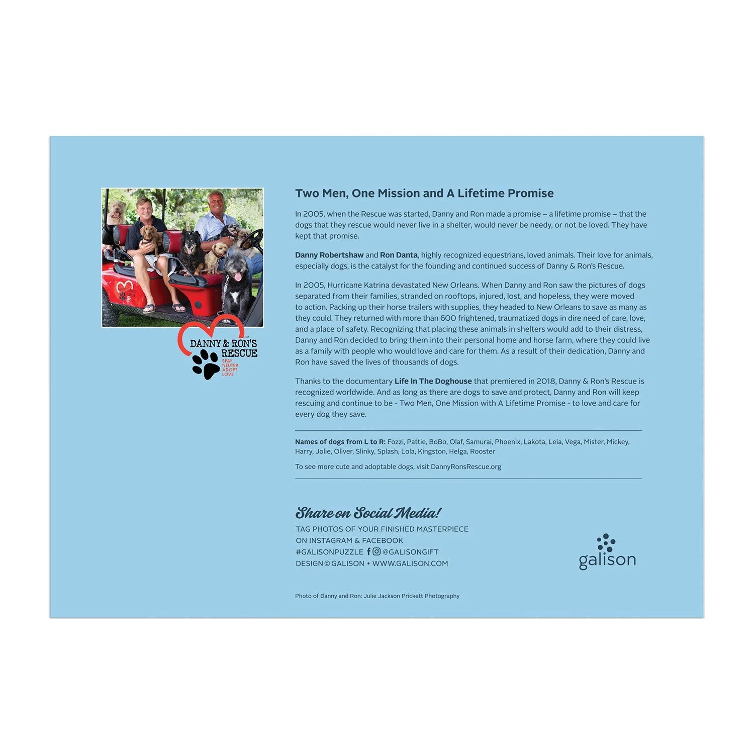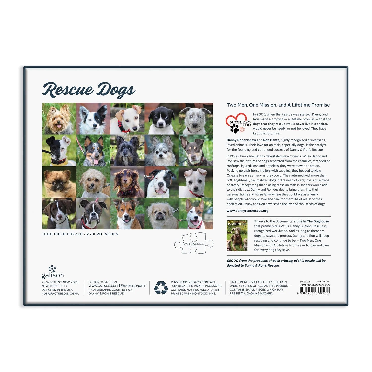 The Rescue Dogs 1000 Piece Puzzle features a grid of 20 photos of adorable dogs who were saved by Danny & Ron's Rescue. This inspiring rescue mission is recognized world-wide thanks to the documentary, Life in the Doghouse, that told the story of their dedication that has saved the lives of thousands of dogs. Galison puzzles are packaged in matte-finish sturdy boxes, perfect for gifting, reuse, and storage. An insert of the full puzzle image is also included.