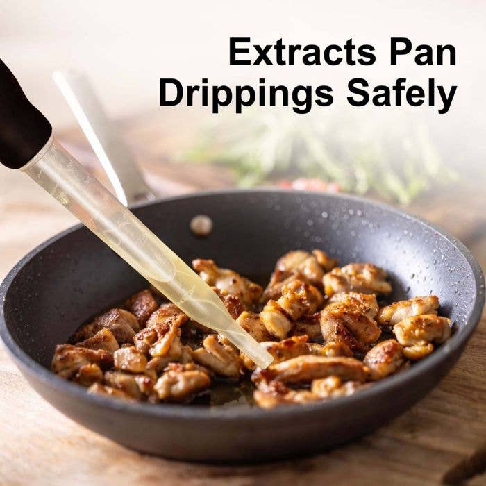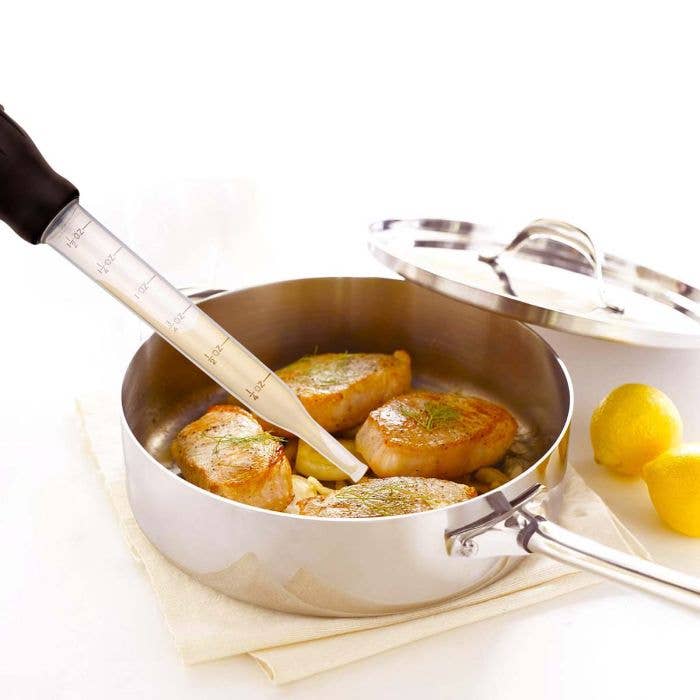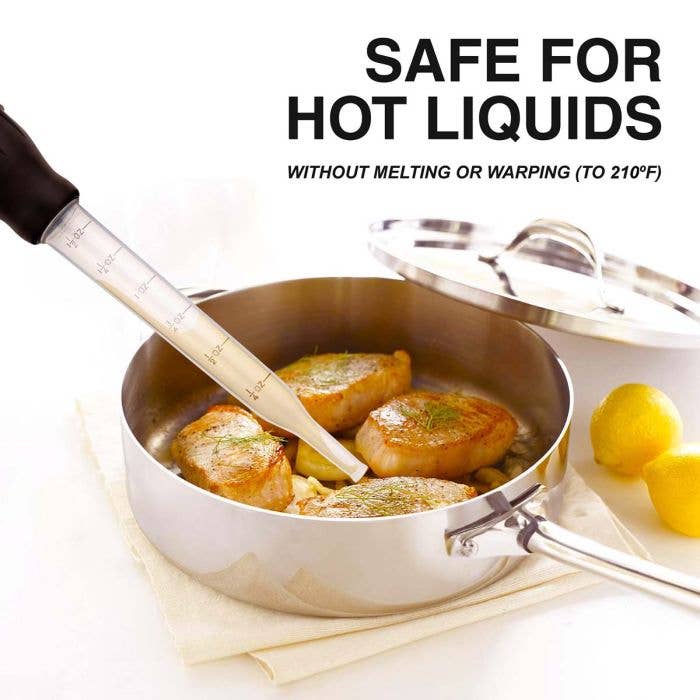 It's specially designed for comfortable use and easy cleanup. The Baster tube is heat-resistant to 210-degrees Fahrenheit with easy-read increments in ounces and milliliters for precise measuring.