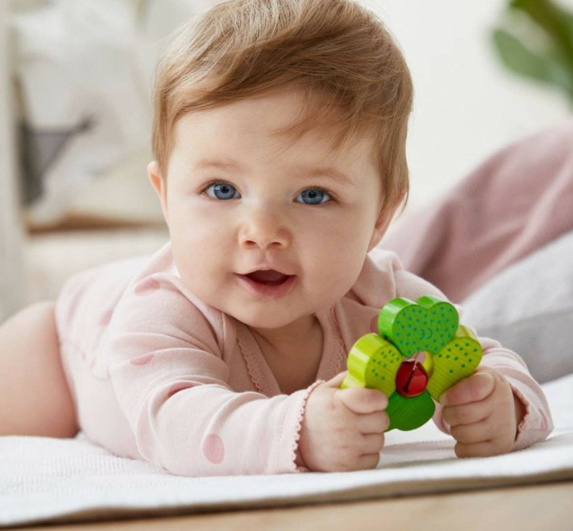 This wooden clutching toy charms babies with its jingle-bell sound effect.