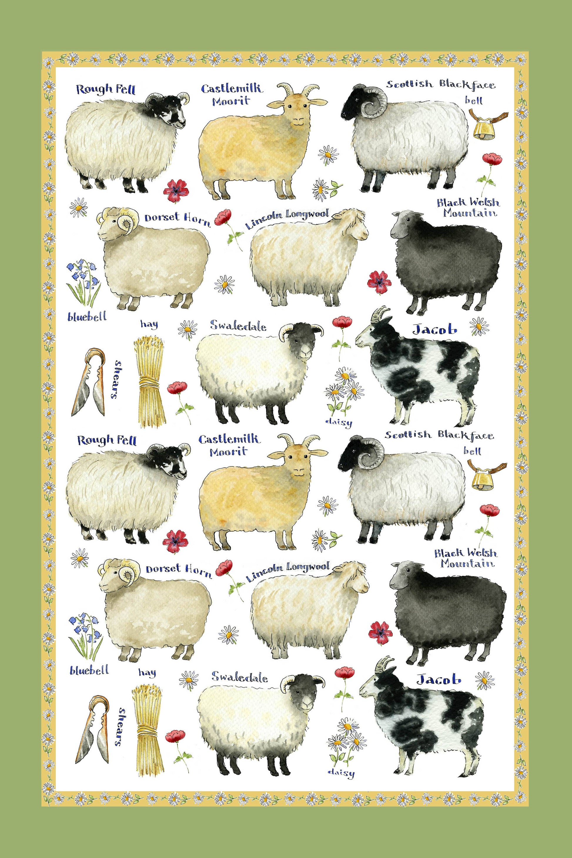 Inspired by our beautiful rural countryside, this hand drawn Cotton Tea Towel is perfect for any lover of farmyard animals. Displaying a variety of adorable Sheep Breeds, complimented by a vibrant green border.