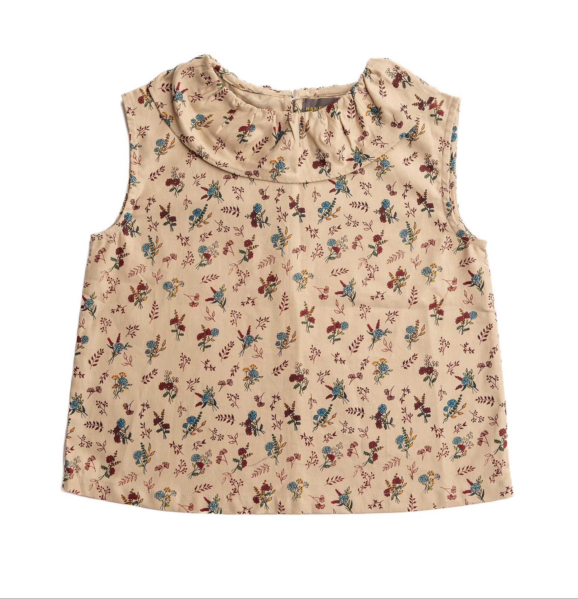 Sleeveless top with floral print and a nice collar. Button closure at the neck.