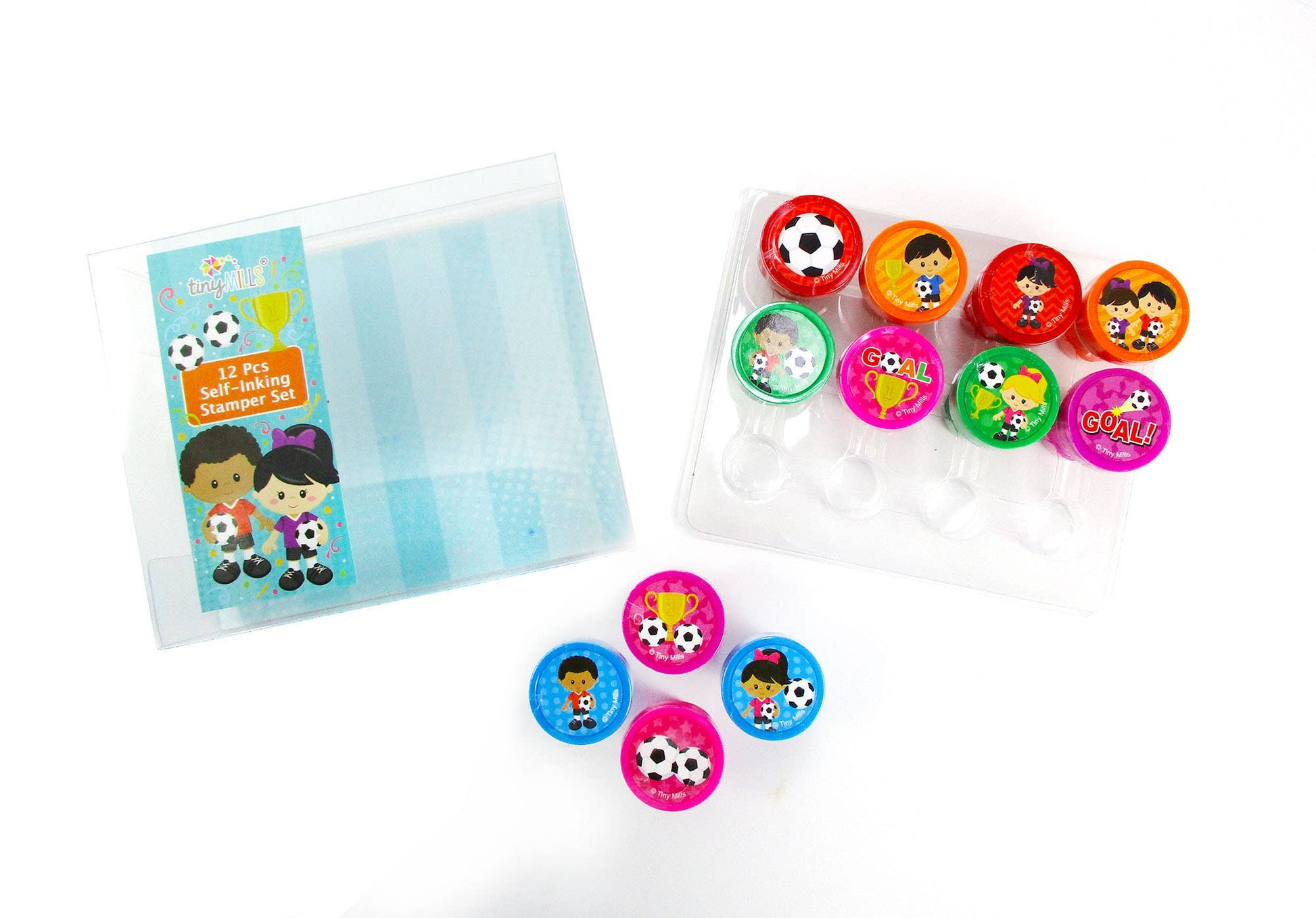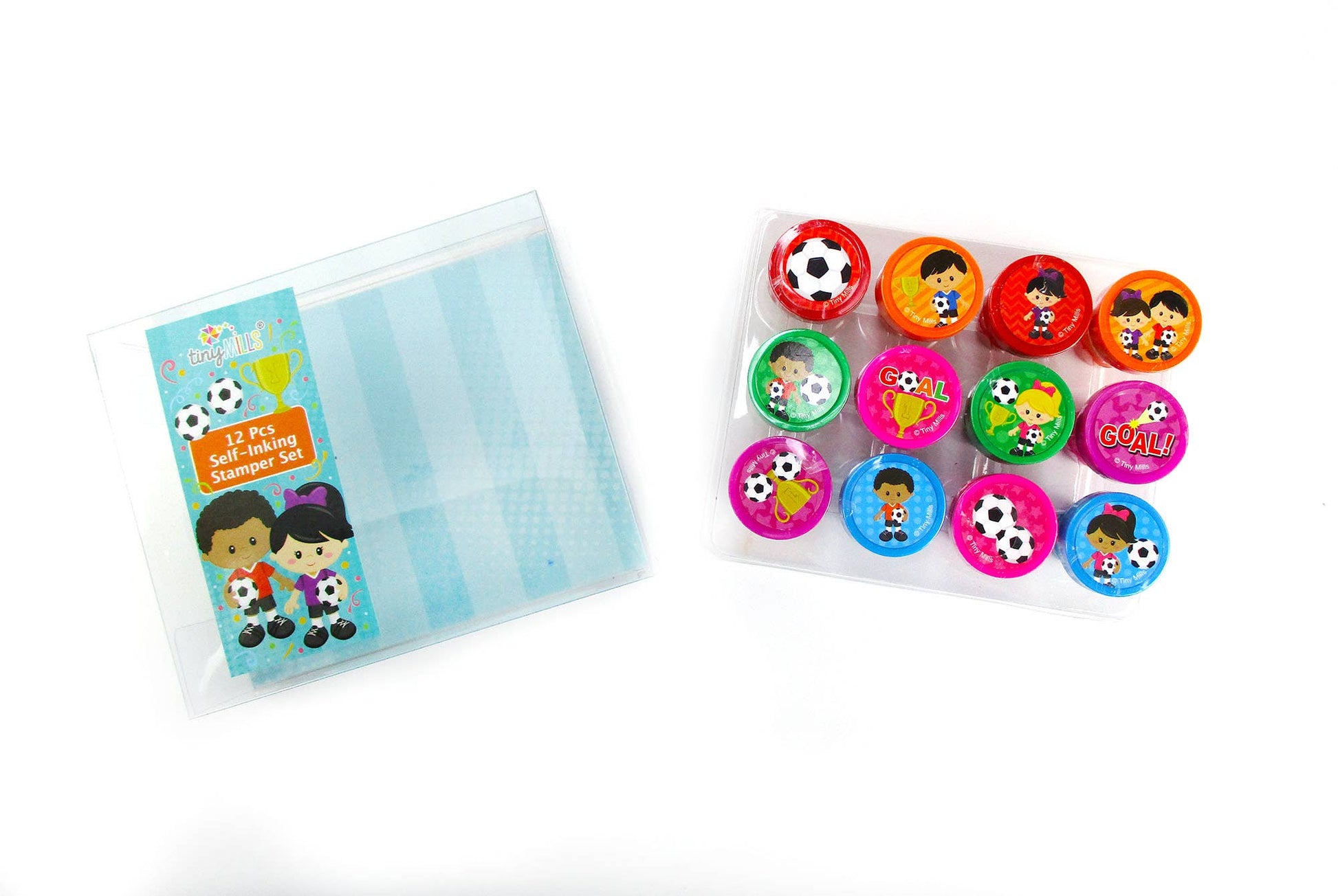 It includes 12 self-inking stampers, each featuring a unique design such as soccer balls, trophies, and charming soccer friends. No ink pad is needed, making stamping quick and mess-free.