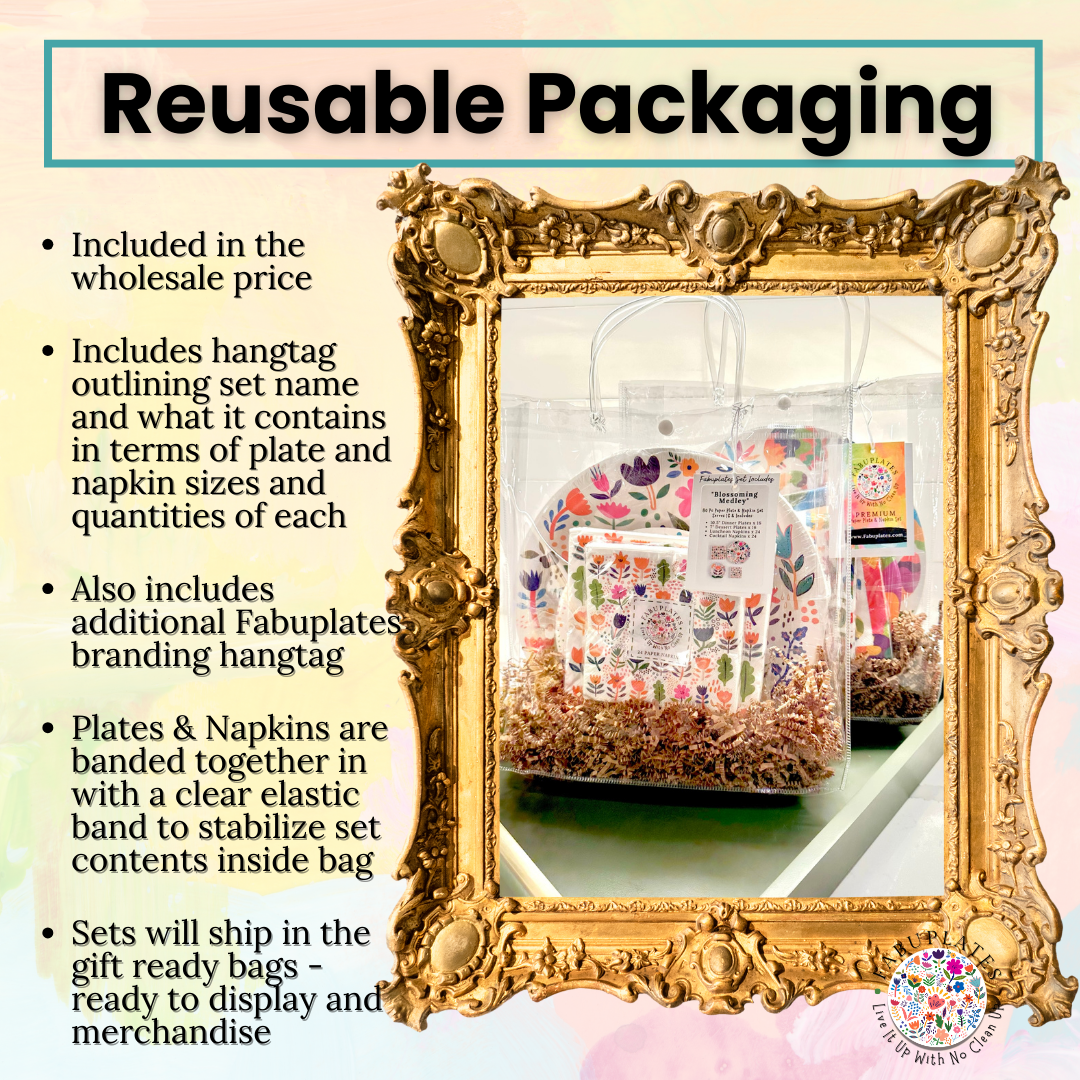 Each set ships in an individual 12" x 12" x 3.25" PVC bag that is reusable and gift ready. The contents of the set will be wrapped twice with a clear elastic band (horizontally and vertically) to stabilize the contents in the bag and sit atop a flurry of kraft colored crinkle paper.