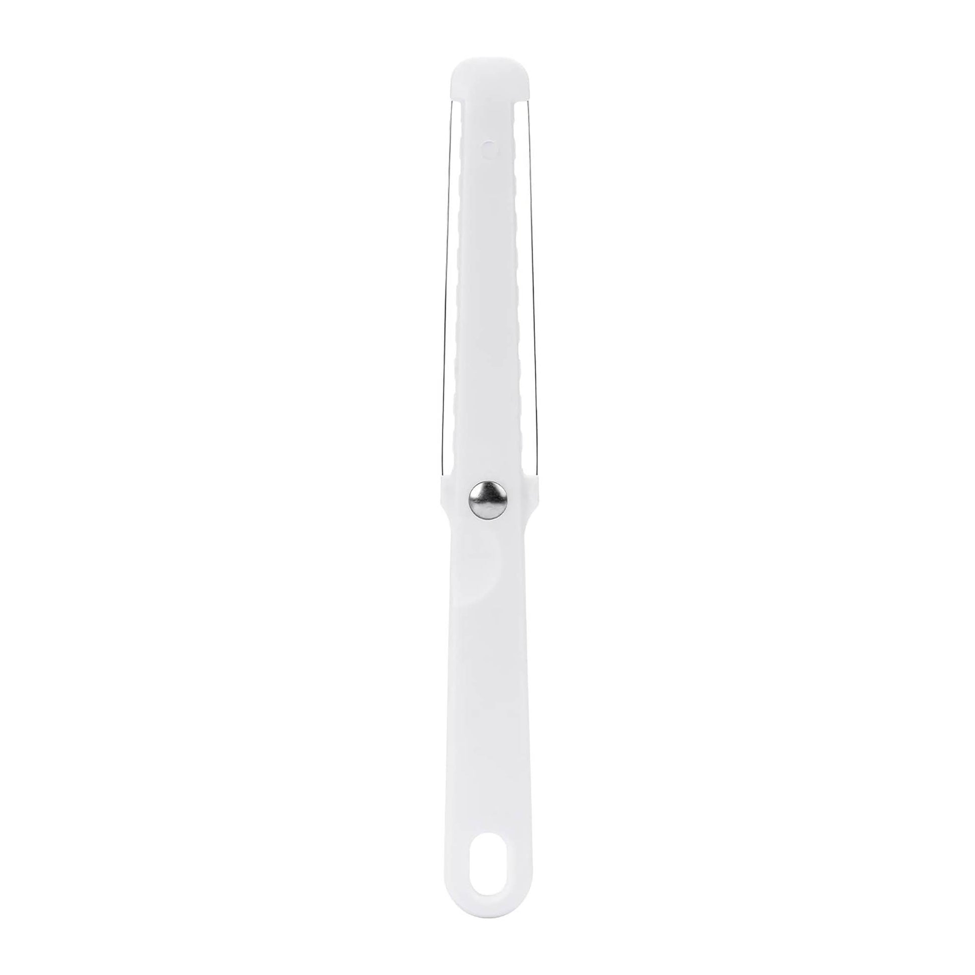 MEASUREMENTS AND CARE: This cheese peeler measures 9” x 1” x 0.5” and is constructed with stainless steel blades and a food safe plastic handle