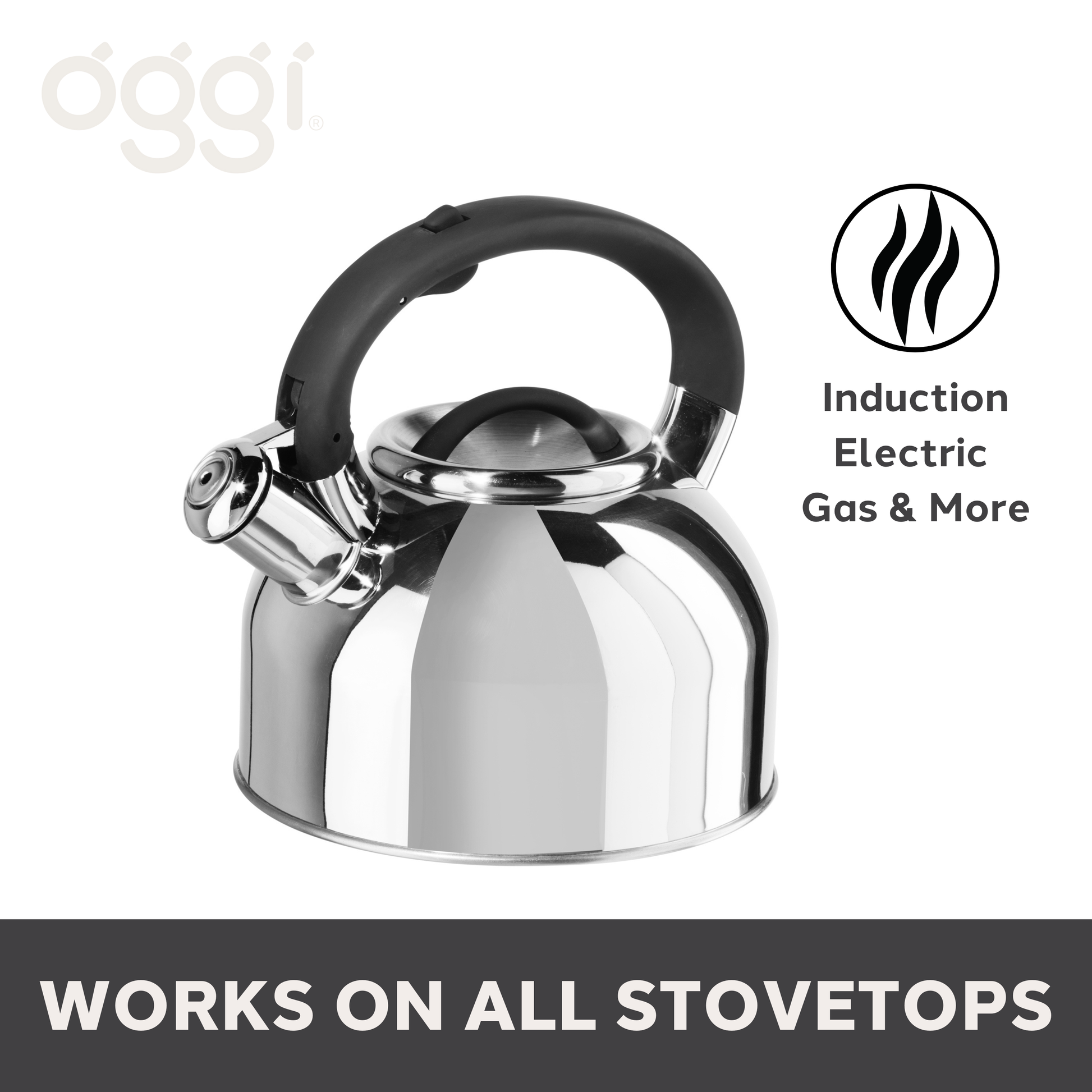 Whistling while it works, OGGI's Stainless Steel Tea Kettle is sure to get the water boiling fast. As the water starts to come to a boil, the teapot whistle comes to life with an easy crescendo letting you know it's ready to pour.