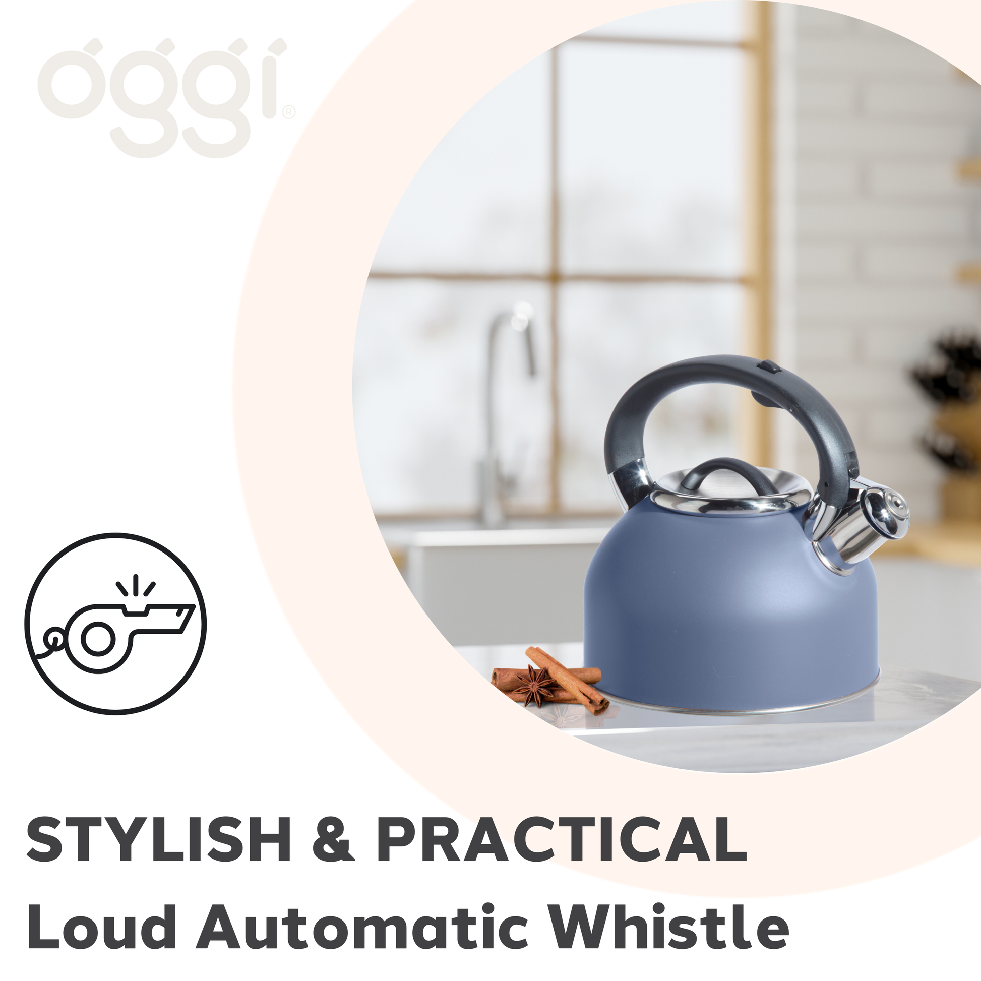 Whistling while it works, OGGI's Stainless Steel Tea Kettle is sure to get the water boiling fast. As the water starts to come to a boil, the teapot whistle comes to life with an easy crescendo letting you know it's ready to pour.