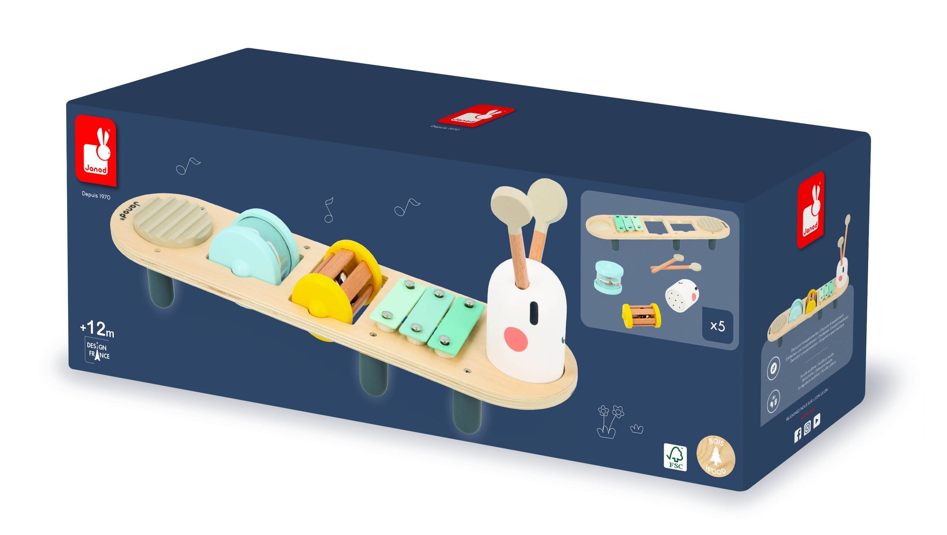 This musical stand has 5 instruments. The head is a maracas that doubles as storage for the beaters. On its back you will find a xylophone and a scratcher in soft colors, as well as 2 removable rattles. The first has 3 bells and the second is a rain stick. Your child can spin them on the base or shake them up and down.