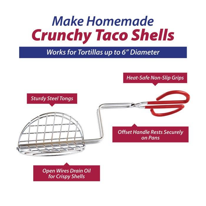 HIC Kitchen's Taco Shell Tong safely forms and fries tortillas (up to 6-inches) into fresh and delicious crispy taco shells without a greasy mess.